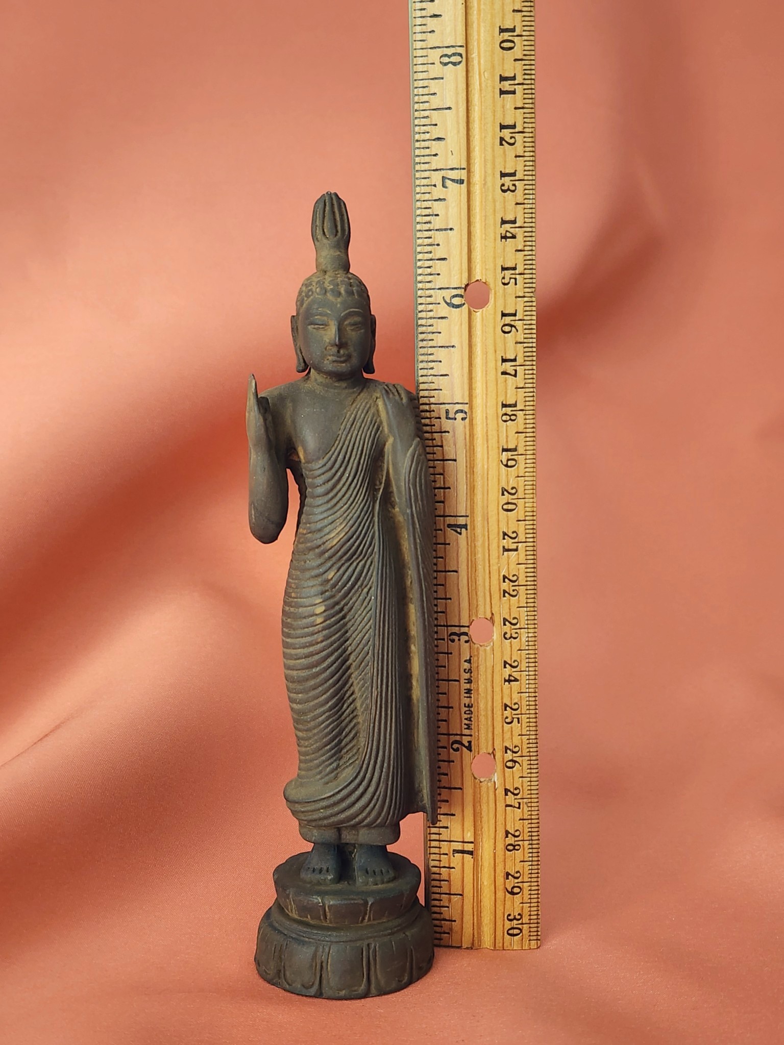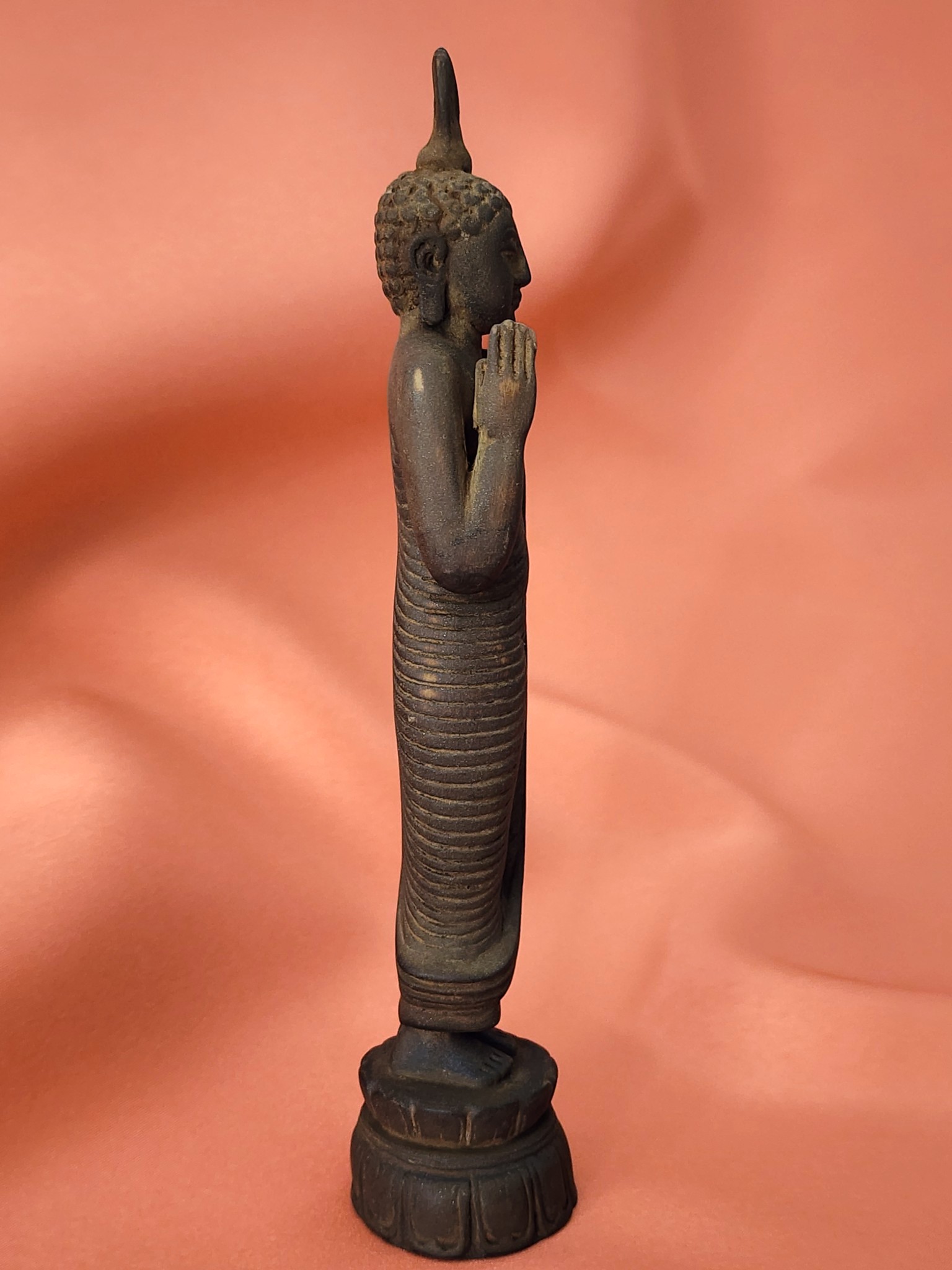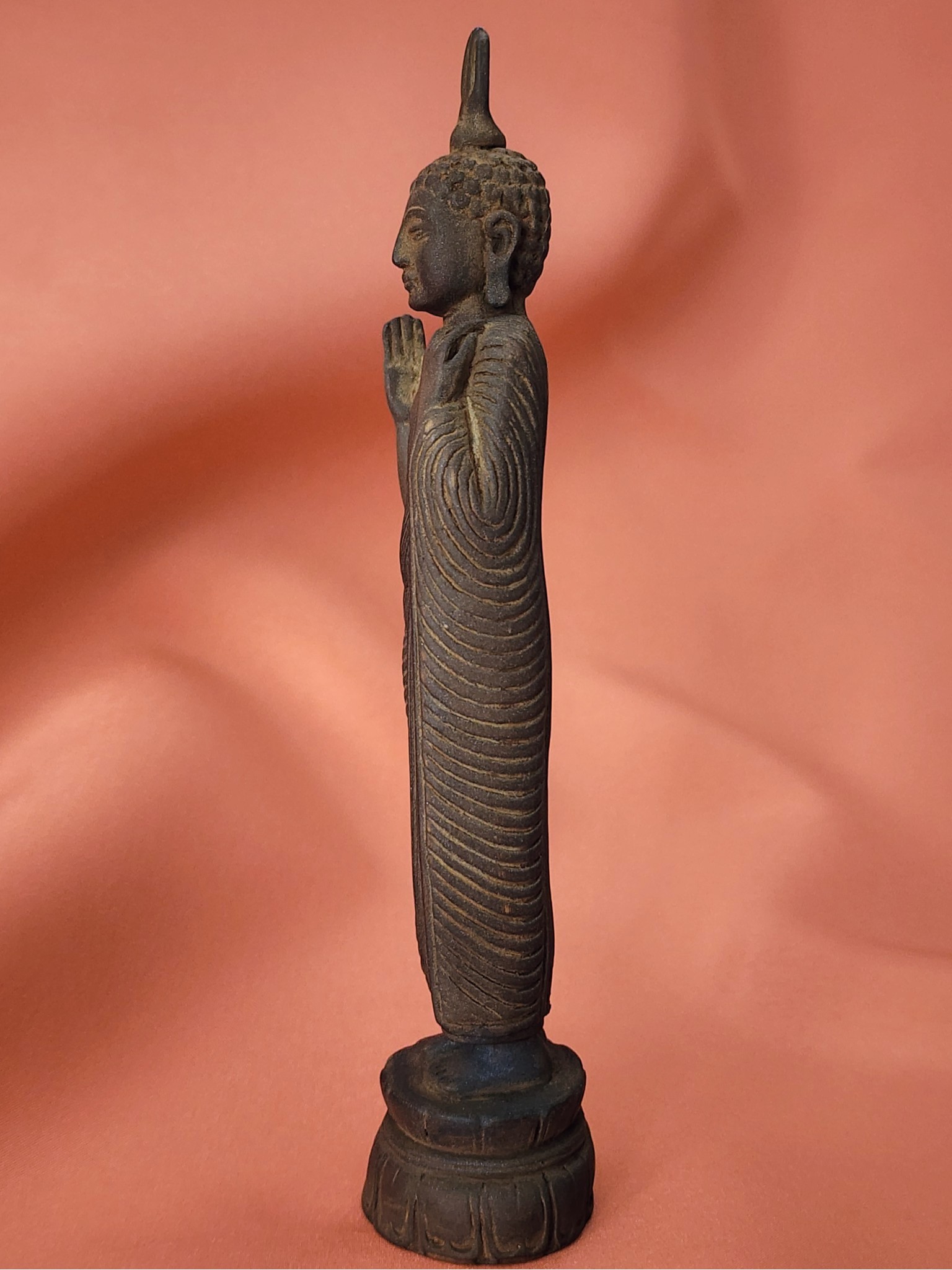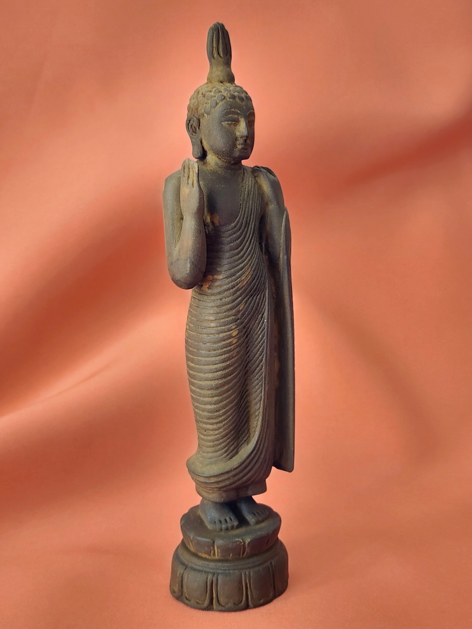 Keywords: antique wood standing Buddha, Sri Lankan temple Buddha, hand-carved Buddha statue, abhaya mudra Buddha, Theravada Buddhist figure, carved wood Buddha Sri Lanka, incense patina Buddha, vintage Buddhist statue, Southeast Asian religious antique, lotus base Buddha figure