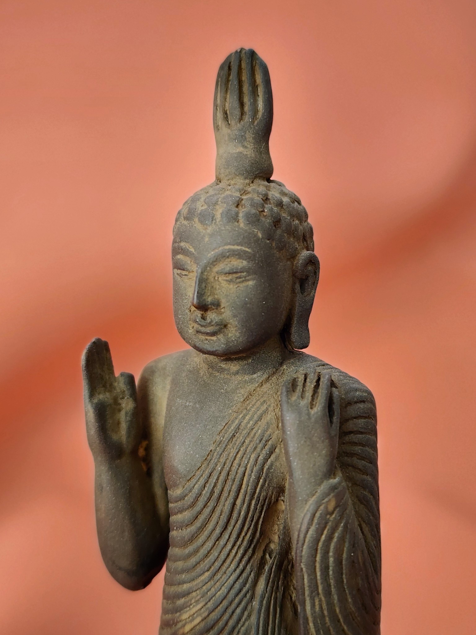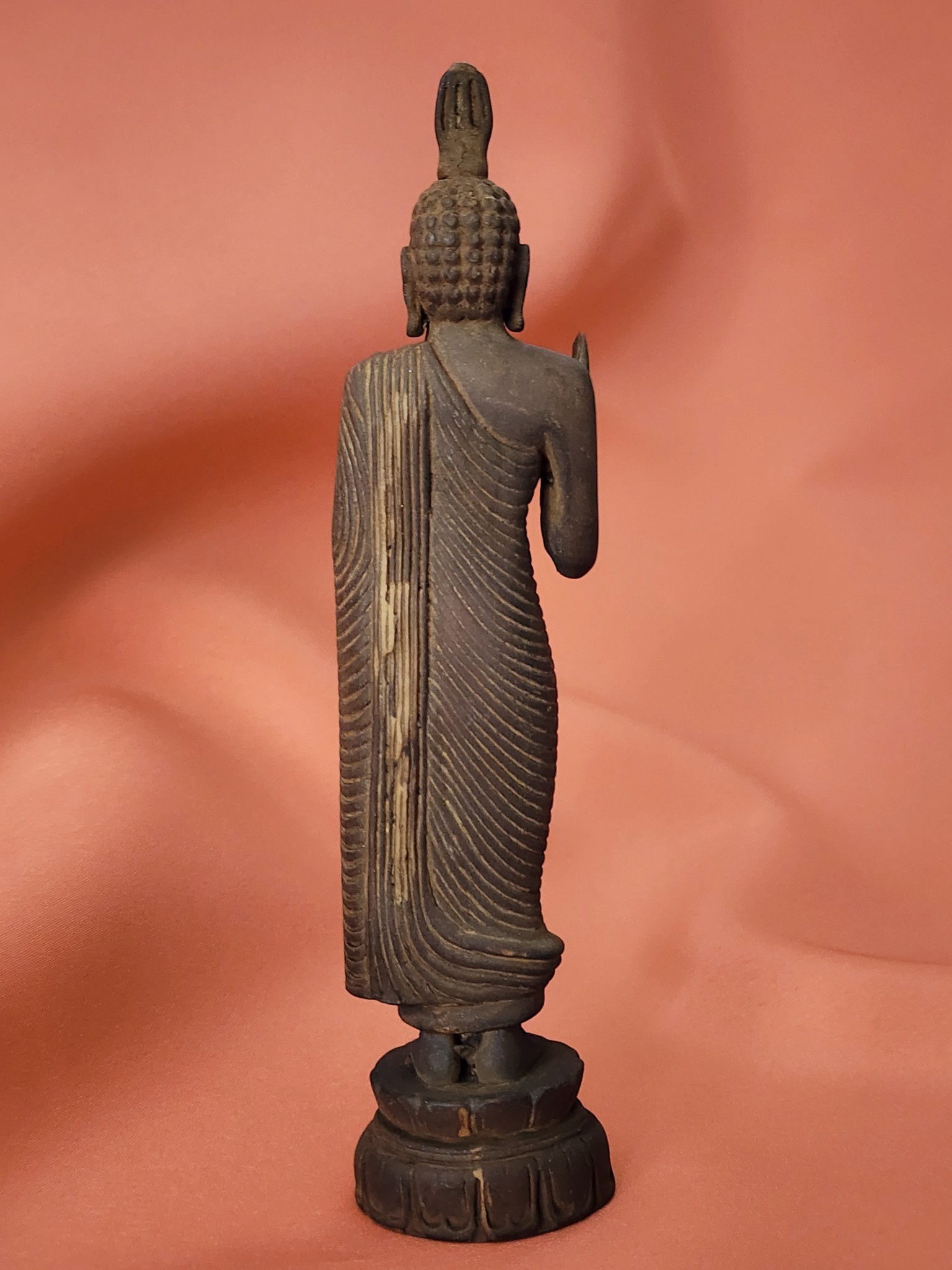 The figure stands in a composed upright posture on a carved lotus pedestal, right hand raised in the abhaya mudra of protection and fearlessness, draped in a monk’s robe rendered in beautifully rhythmic parallel carved lines that flow with remarkable fluidity for hand-carved wood. The ushnisha crown rises to a distinctive flame finial, and the curled hair knots of the head are rendered in careful dotted relief. The back is as fully finished as the front — a hallmark of devotional rather than decorative intent.