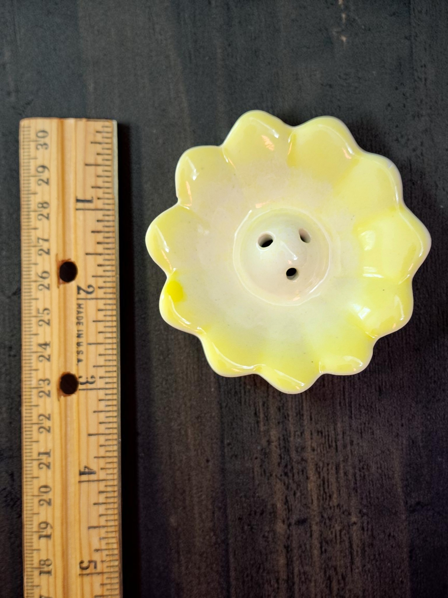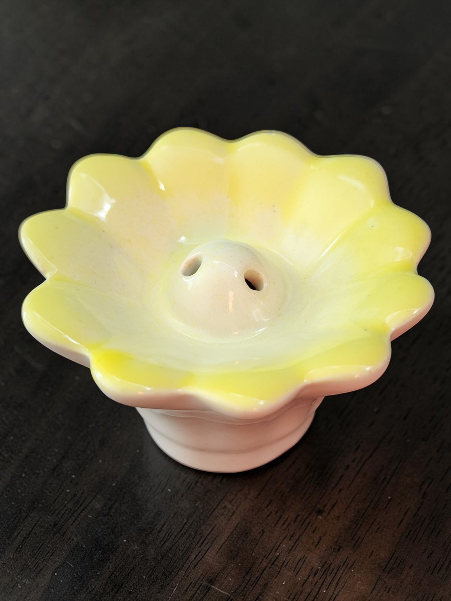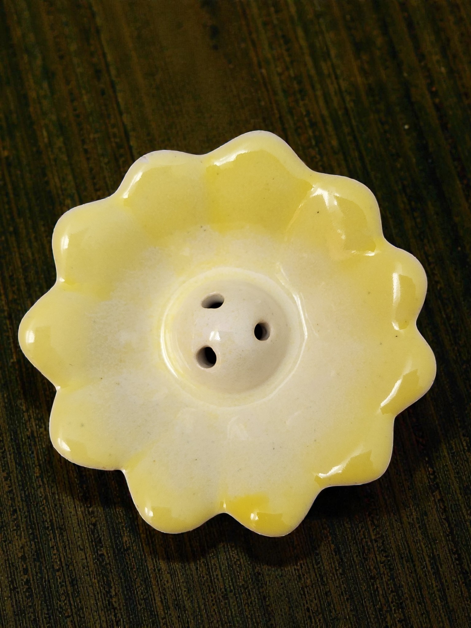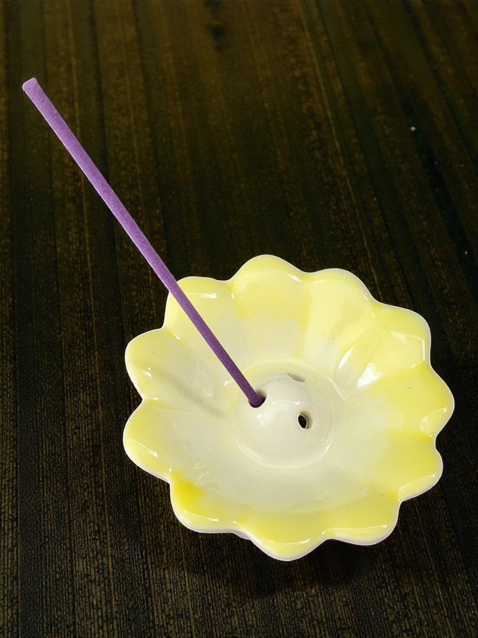 These charming hand-glazed ceramic incense holders from Sri Lanka bring a soft, organic elegance to any meditation space, altar, or home fragrance setup. Each piece is shaped as an open flower — petals scalloped and flared in a loose lotus form — with 3 small central holes to hold standard incense sticks securely upright. The glaze transitions beautifully from saturated color at the petal edges to a soft creamy white at the centre, creating a natural ombre effect unique to each piece. Available in blush pink and soft yellow, both colorways carry the gentle, handmade charm that only ceramic craft can deliver.