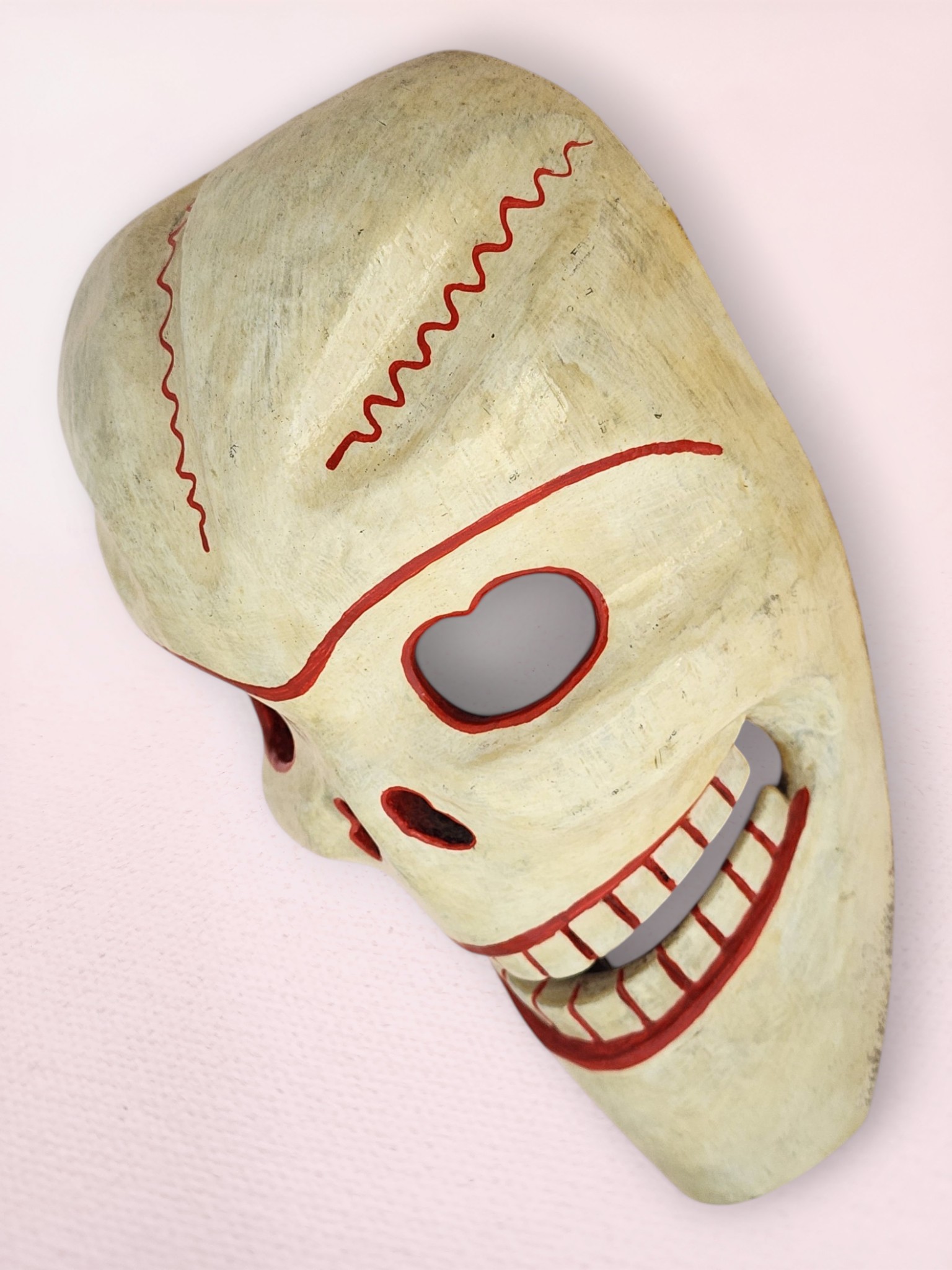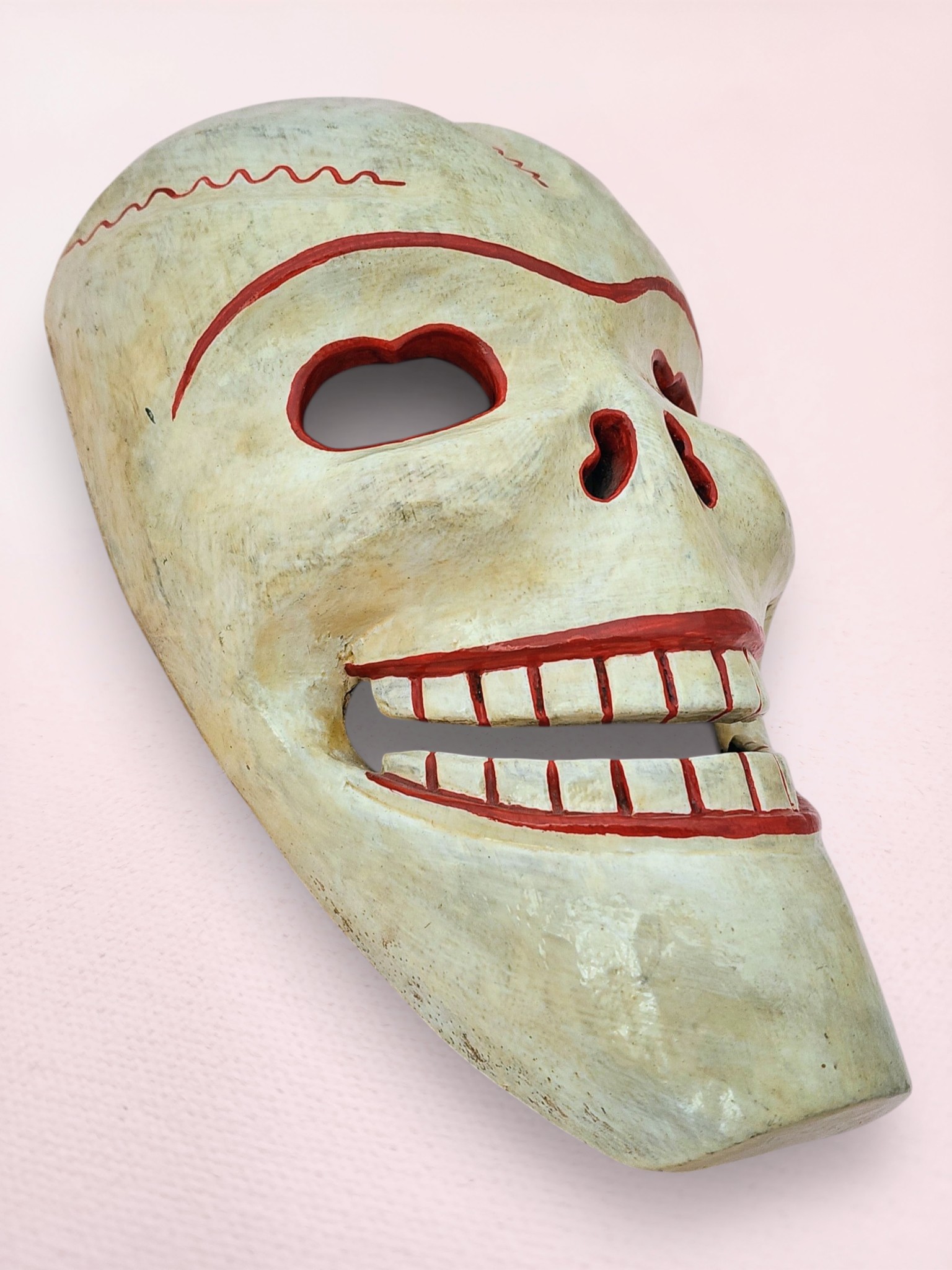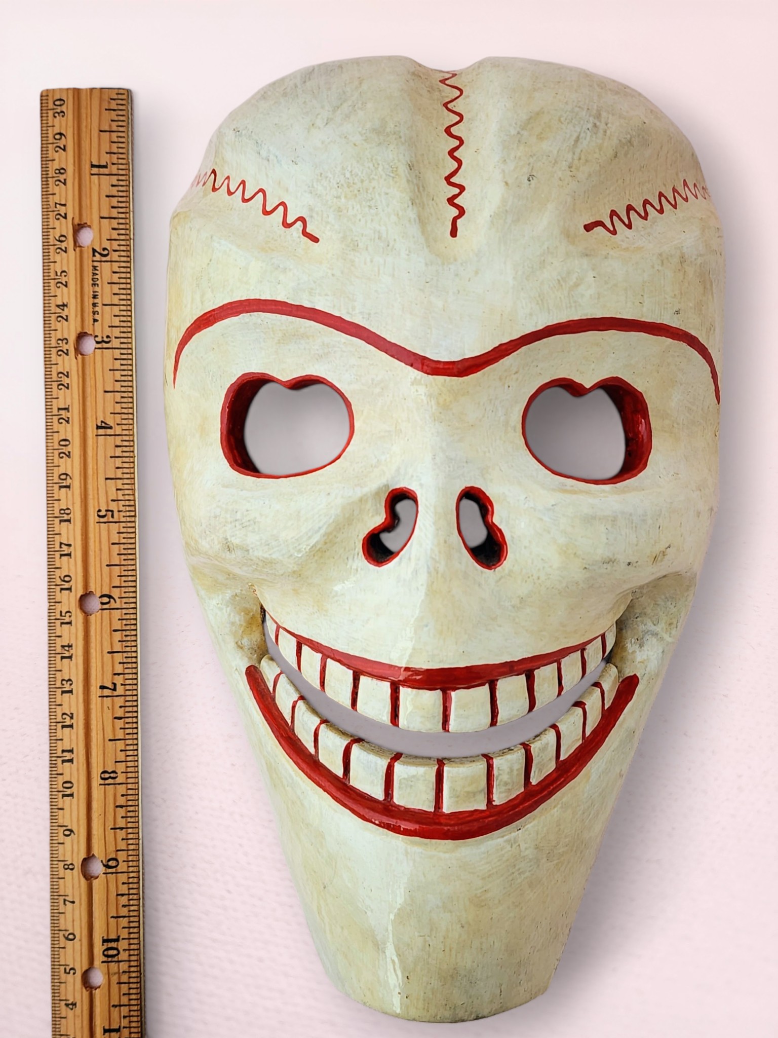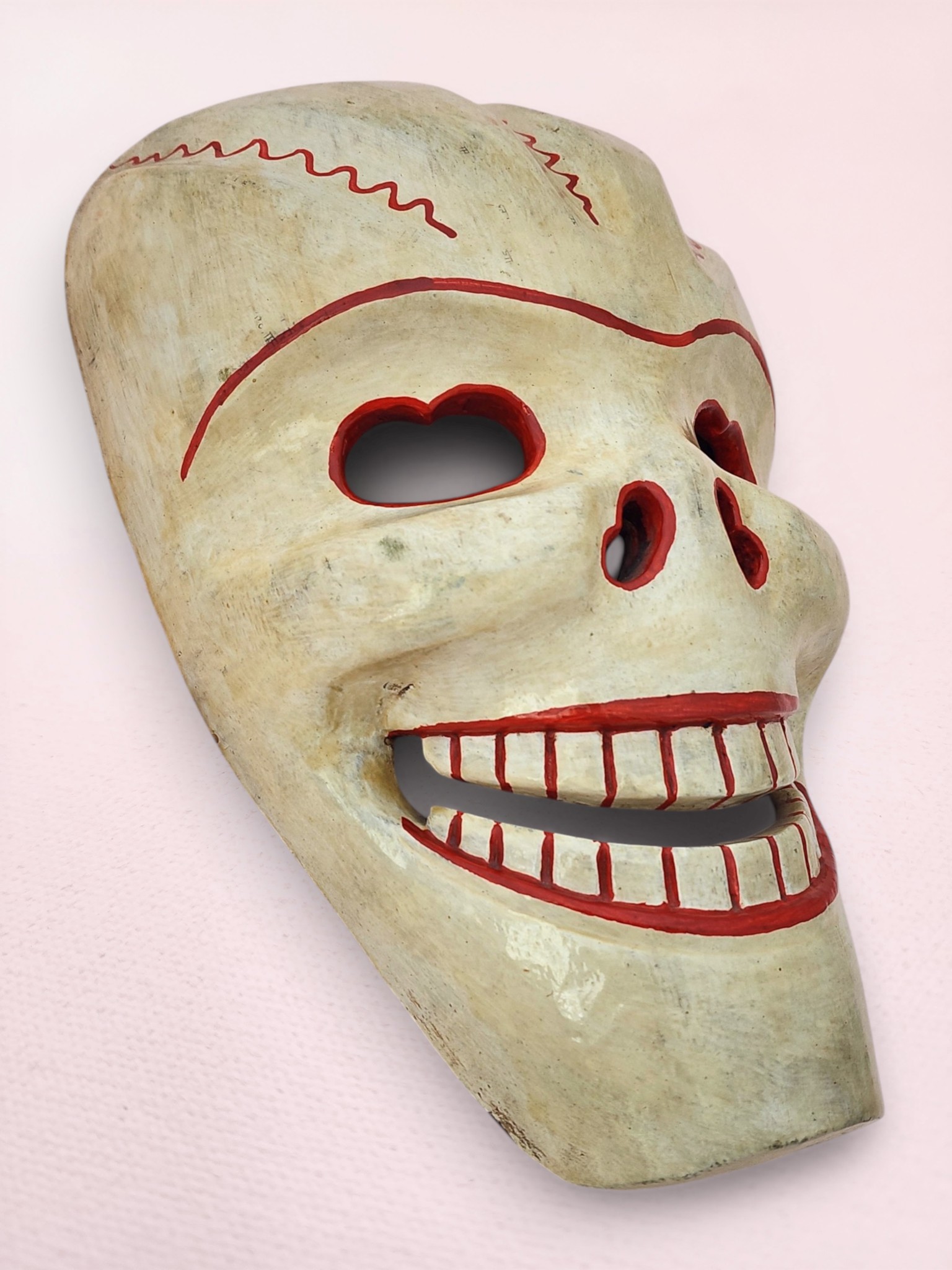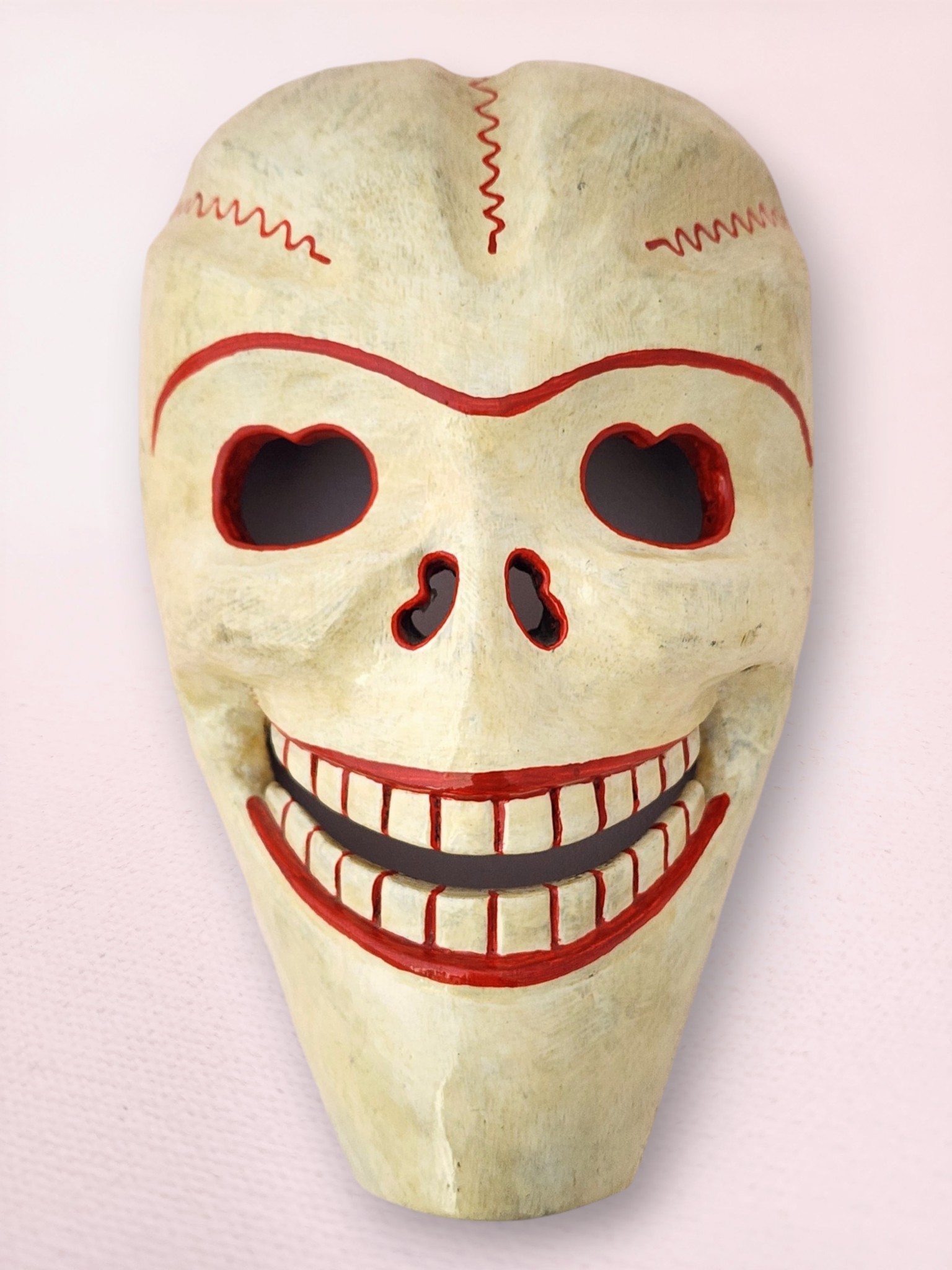 This traditional Himalayan skull mask features intricate hand-painted details with vibrant red accents highlighting the eye sockets, nasal cavities, and signature grinning teeth. The weathered ivory finish creates an authentic ancient appearance, while red zigzag patterns across the cranium represent sacred energy flows and spiritual protection. This piece can be hung on a wall or placed on a table, shelf, or alter.