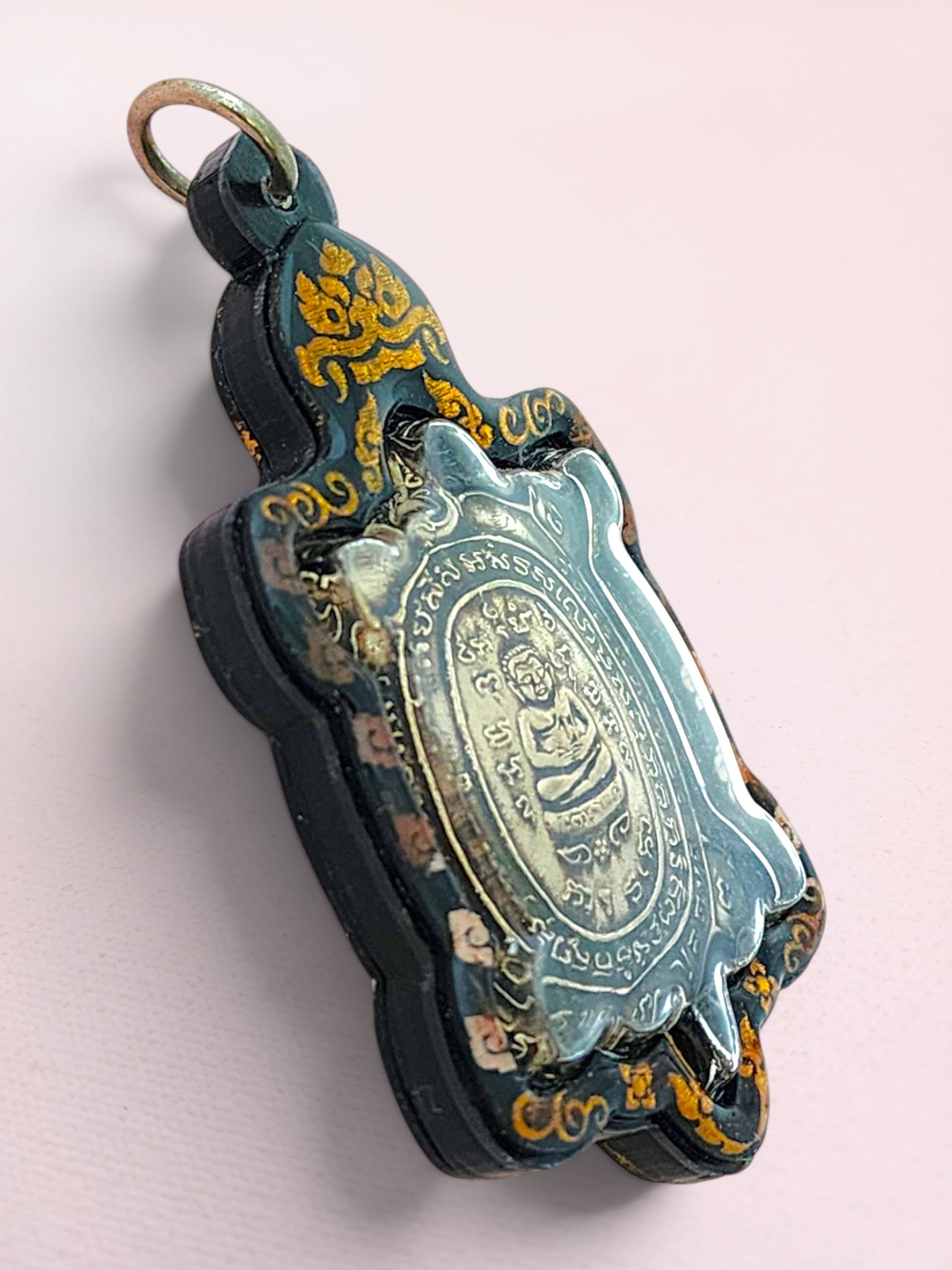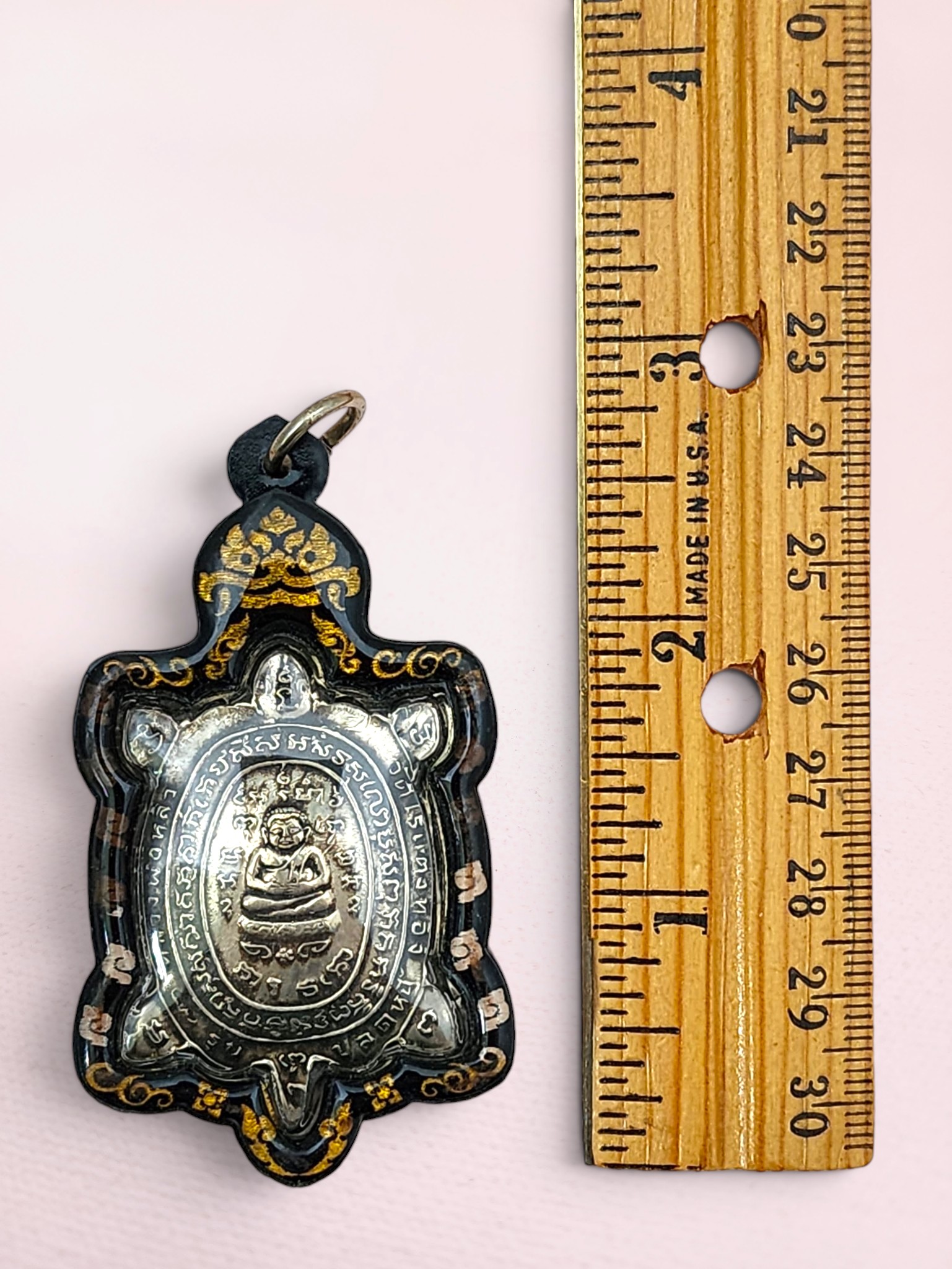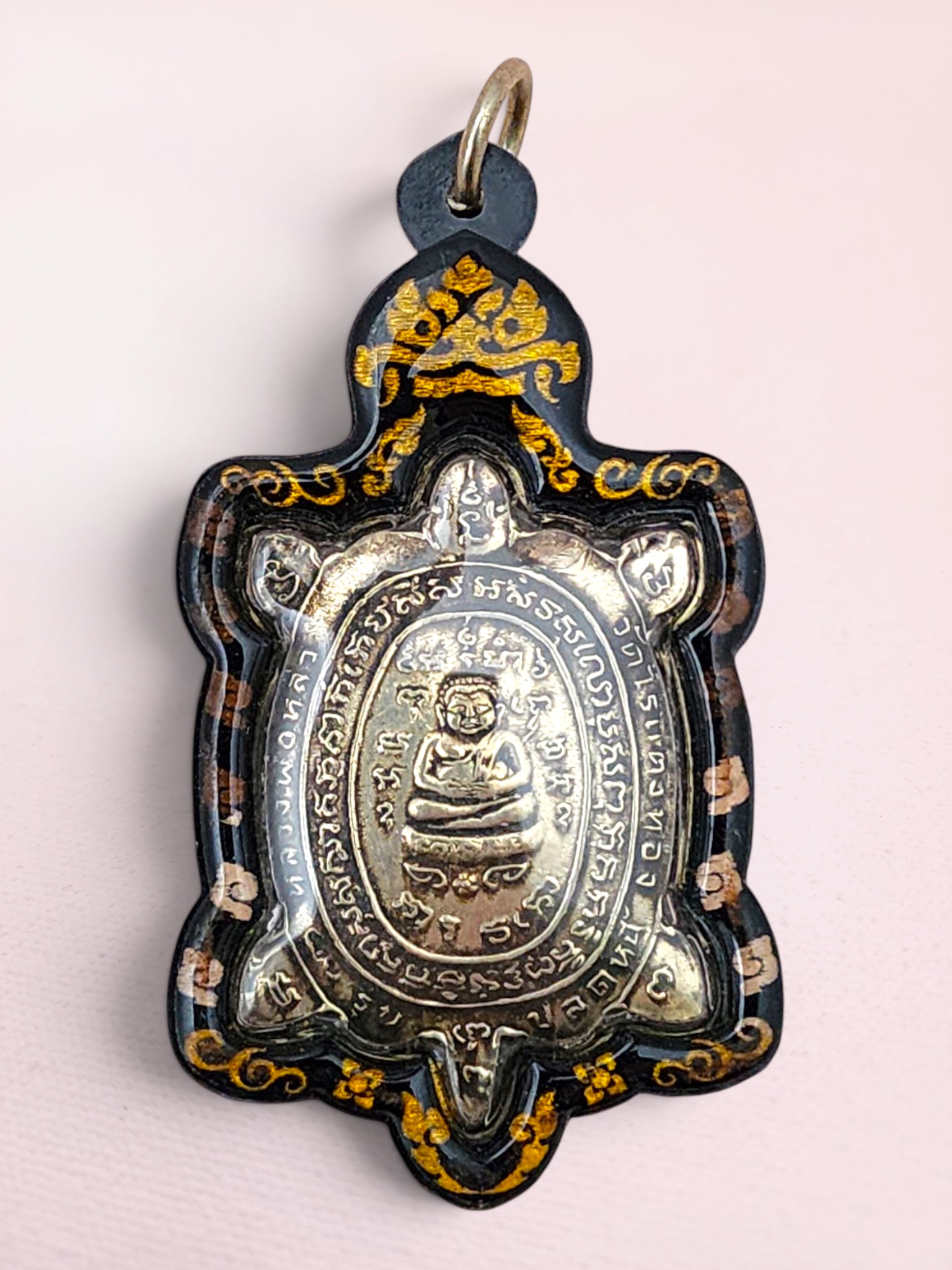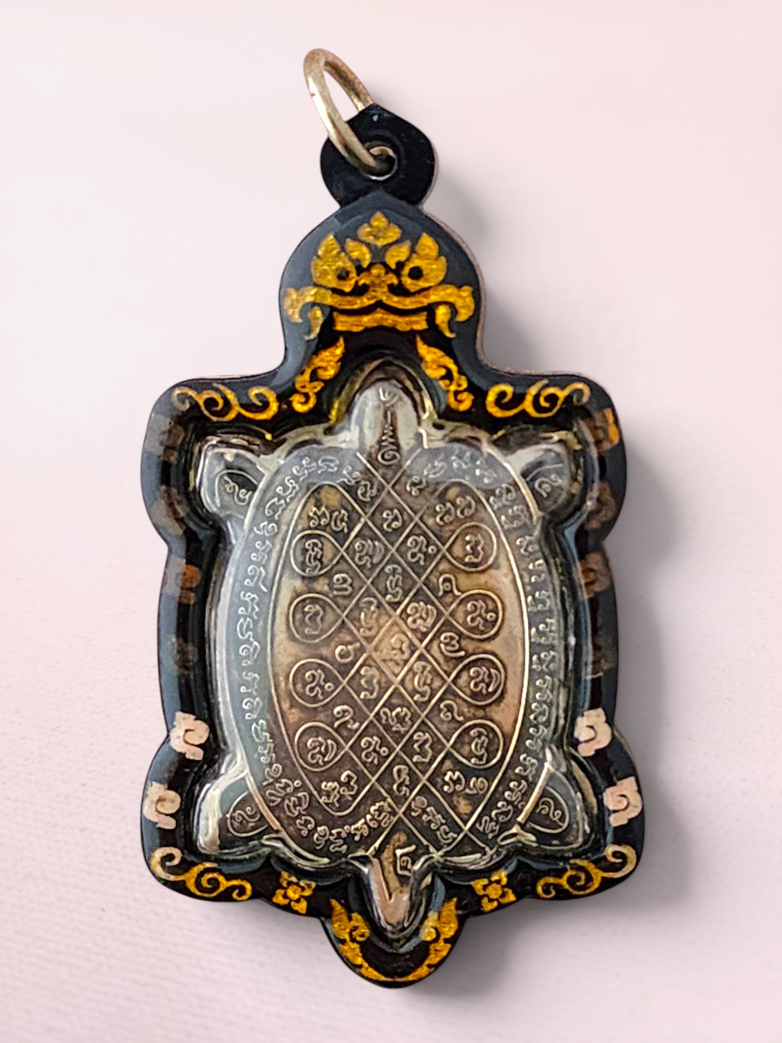 Encased Luang Pu Liew Phaya Tao King Turtle amulet. Black lacquer turtle frame, seated Buddha front, Khom yantra grid reverse. Thai wealth talisman pendant.