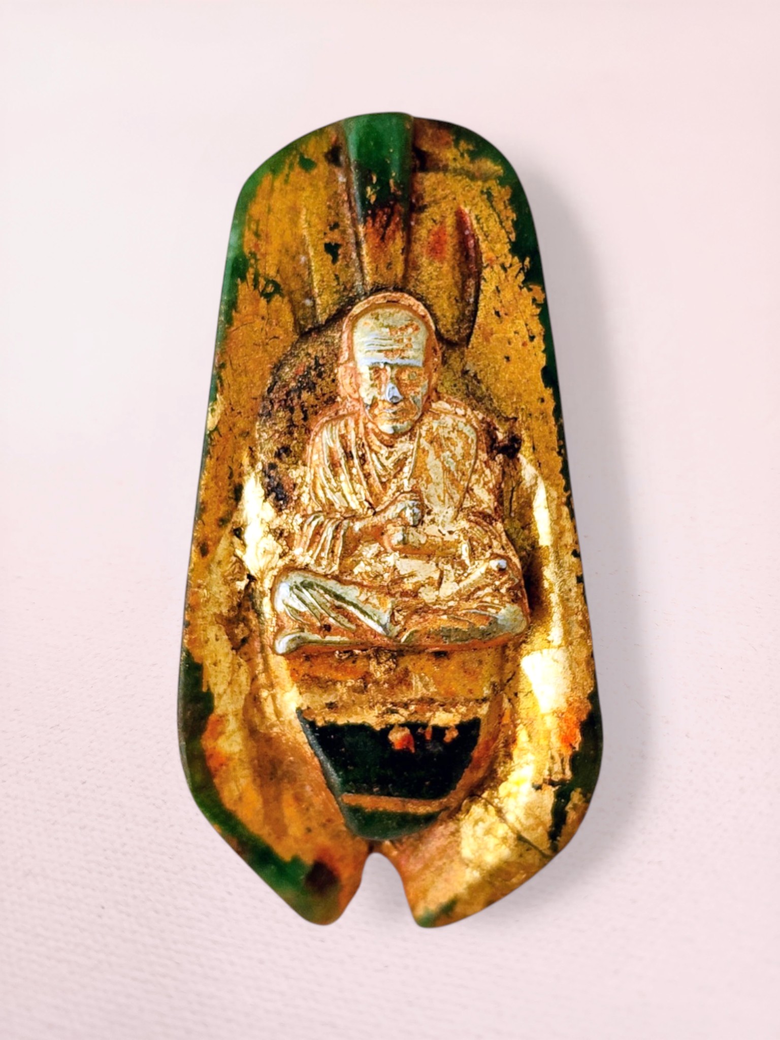 Discover authentic Thai spiritual protection with this unique green stone beetle amulet featuring lustrous gold paint accents and Luang Pu Thuat. This hand-carved Thai beetle amulet combines natural stone craftsmanship with sacred Buddhist blessings for protection and good fortune.