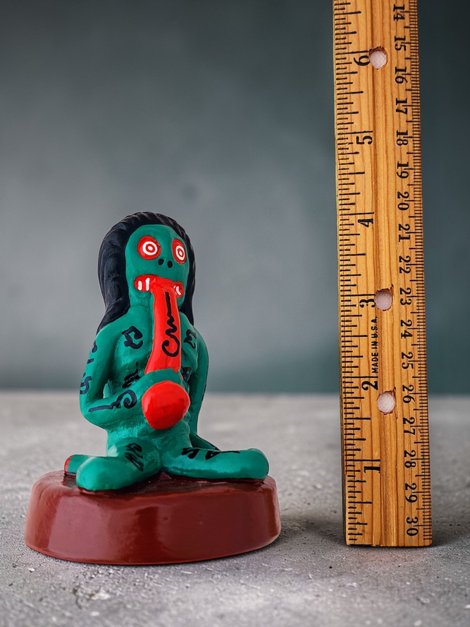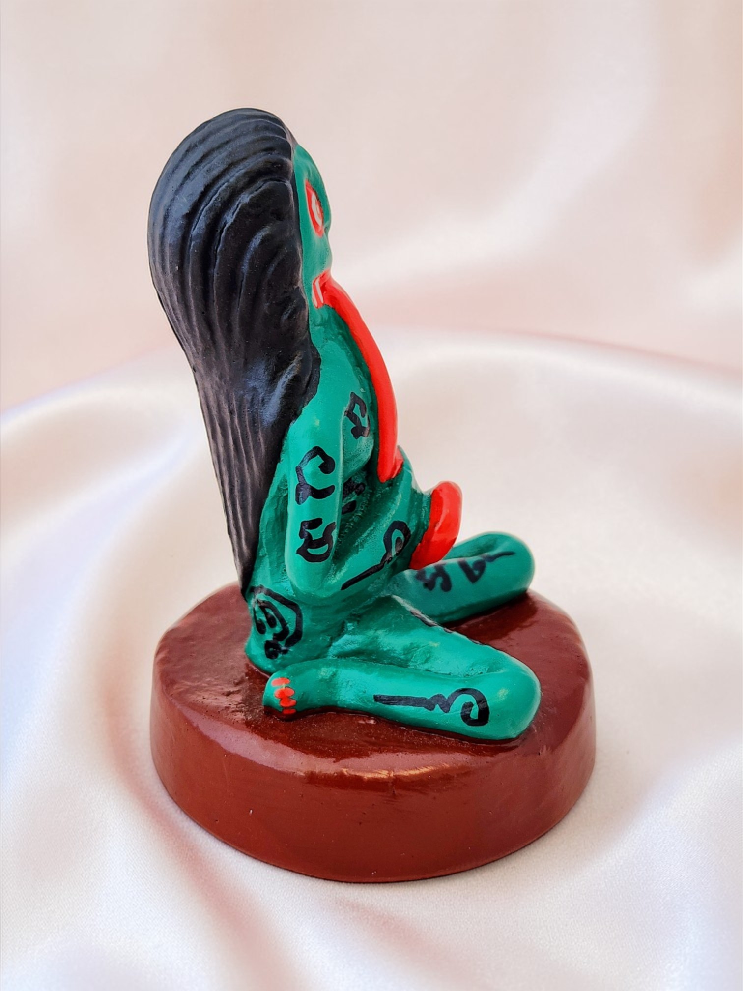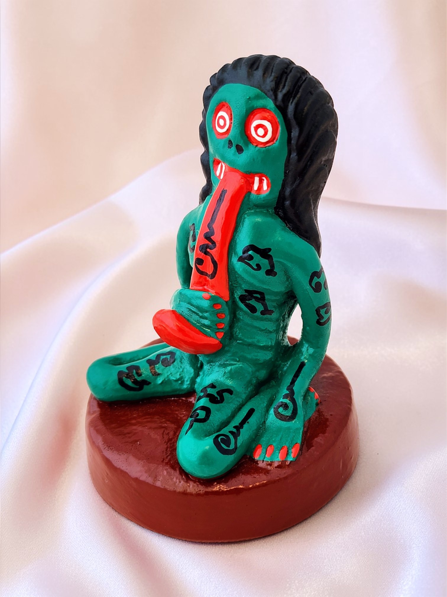The statue depicts the Krasue (also called Krahang or Ahp) in her seated form. In Southeast Asian folklore, Krasue is often portrayed as a floating female head and torso with dangling internal organs. The figure features bulging red and white eyes, protruding red tongue, black hair, and Thai sak yant script inscriptions covering the body for spiritual protection. The ghoulish yet folk-art style captures the eerie essence of this legendary Southeast Asian ghost.