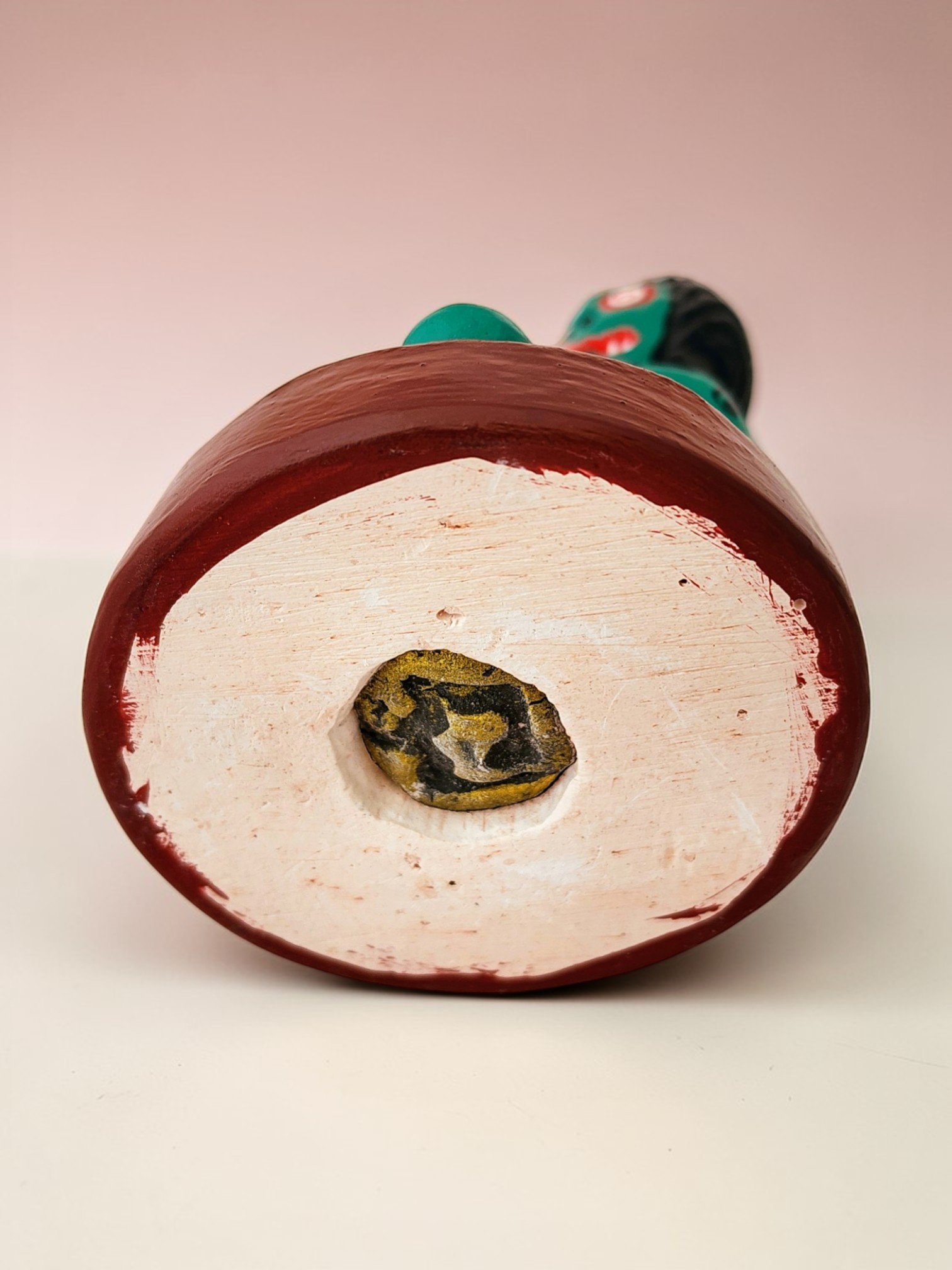 Mounted on a solid brown base measuring approximately 4 inches tall, the bottom shows an authentic gold-painted temple stamp or Yantra seal, confirming traditional Thai blessing and spiritual practices. The hand-painted details and folk art aesthetic make this a fascinating conversation piece.