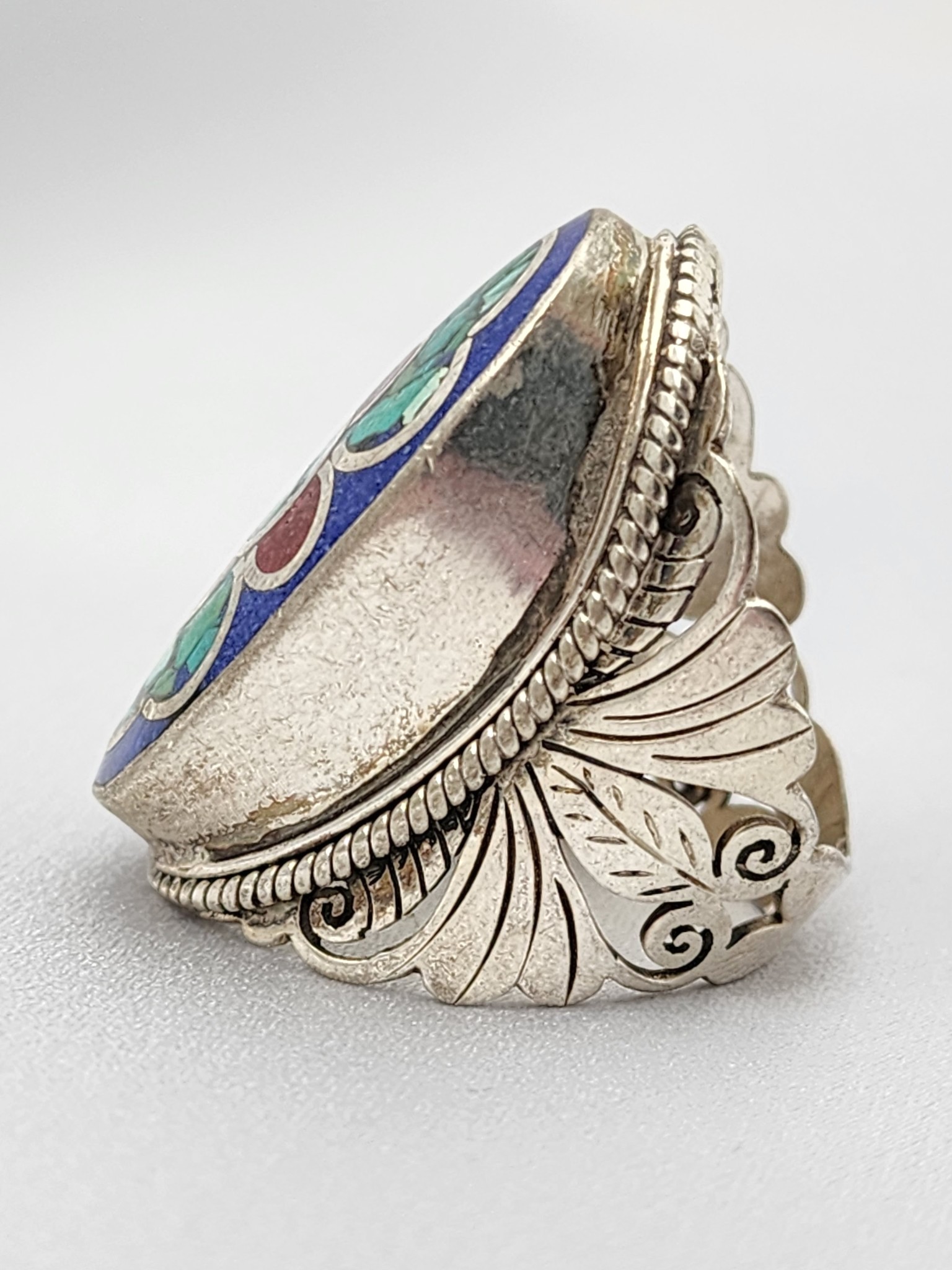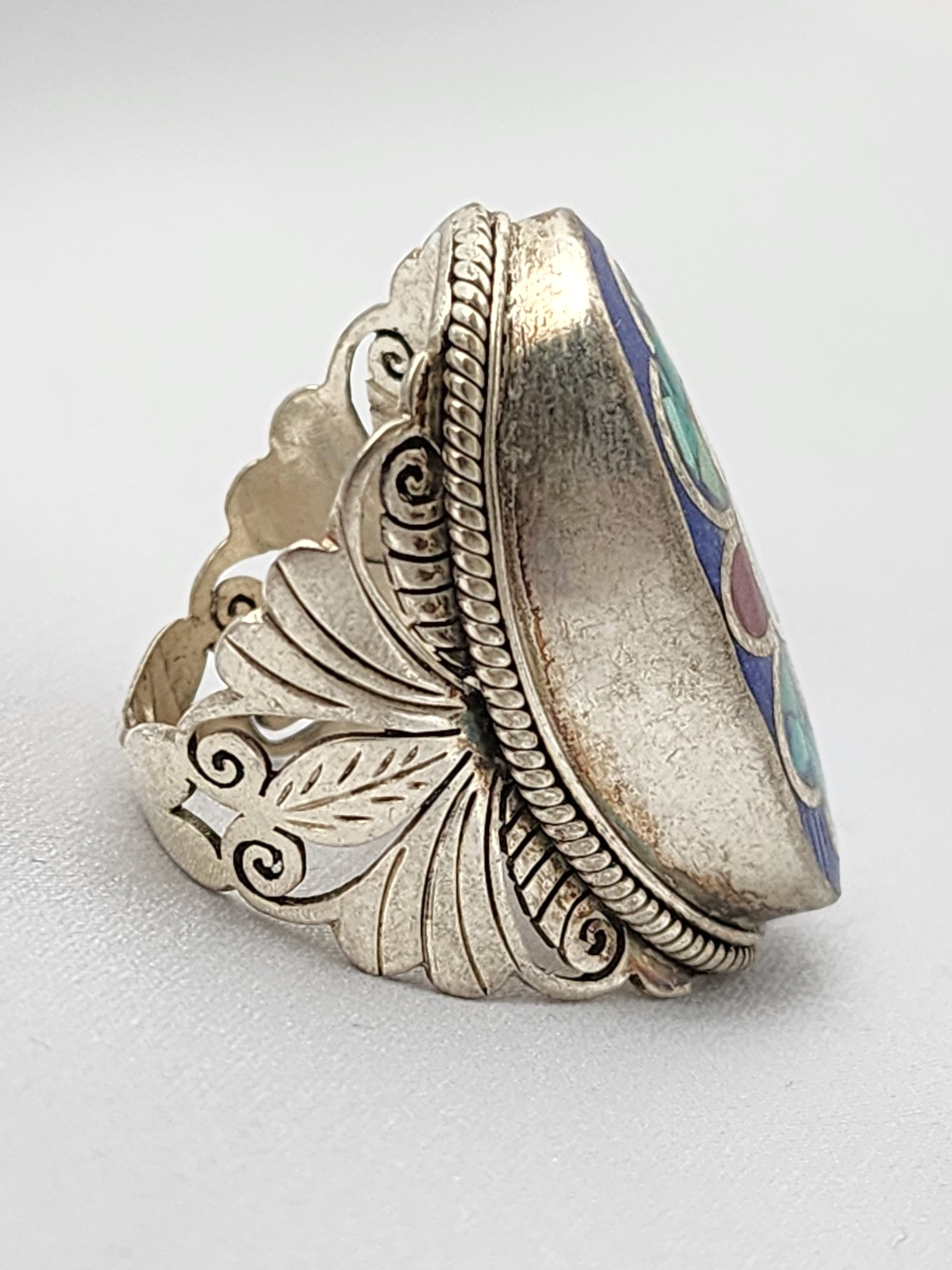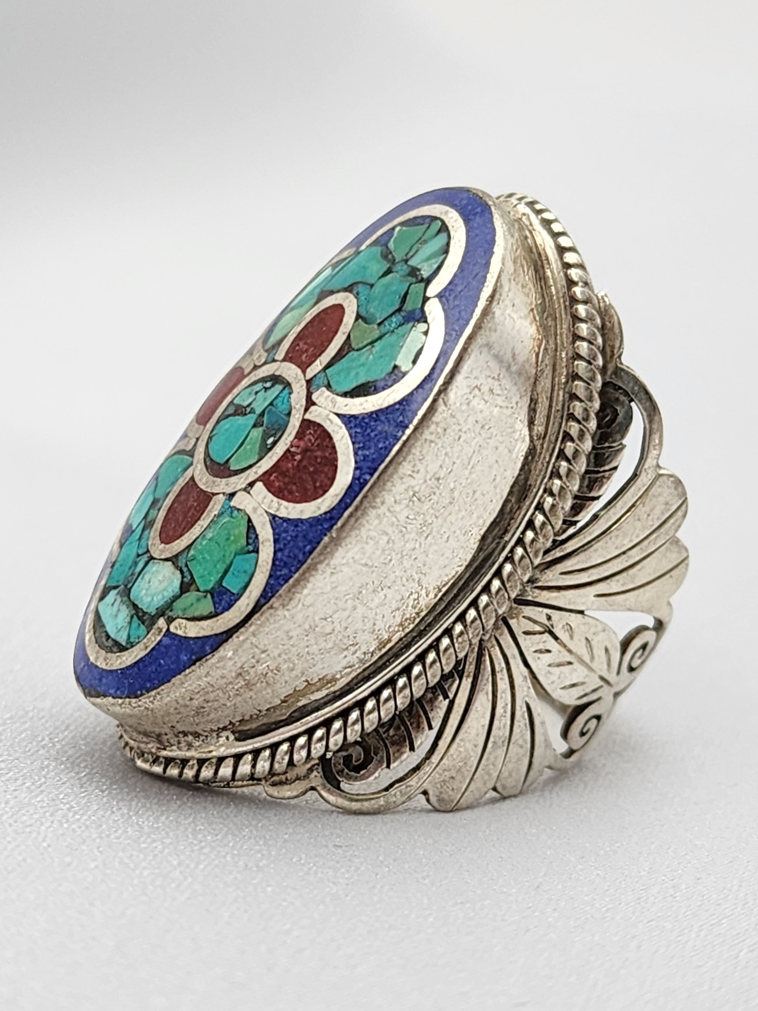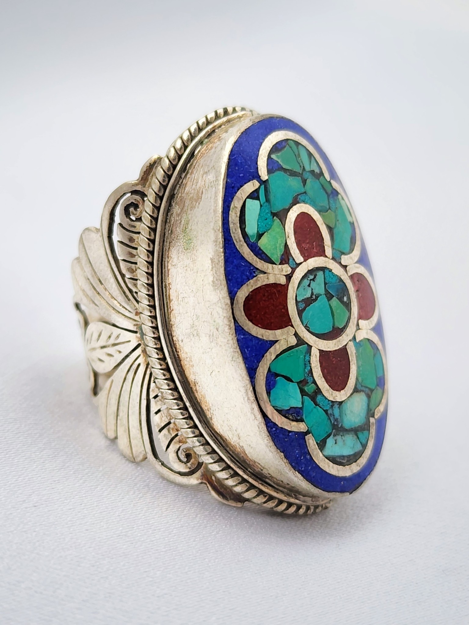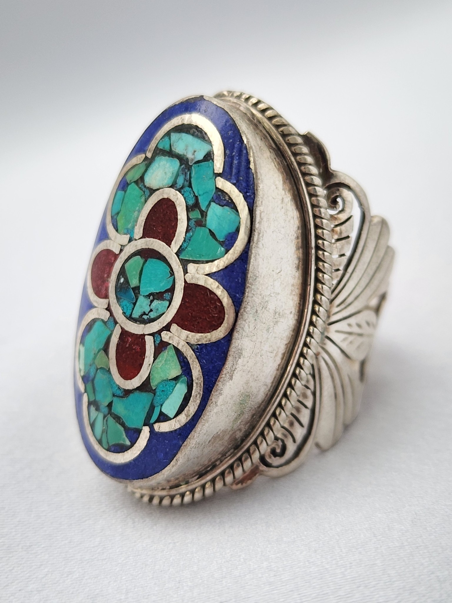Nepal silver ring with lapis lazuli mosaic face and turquoise coral flower inlay. Pierced feather scroll band. Himalayan ethnic statement ring.