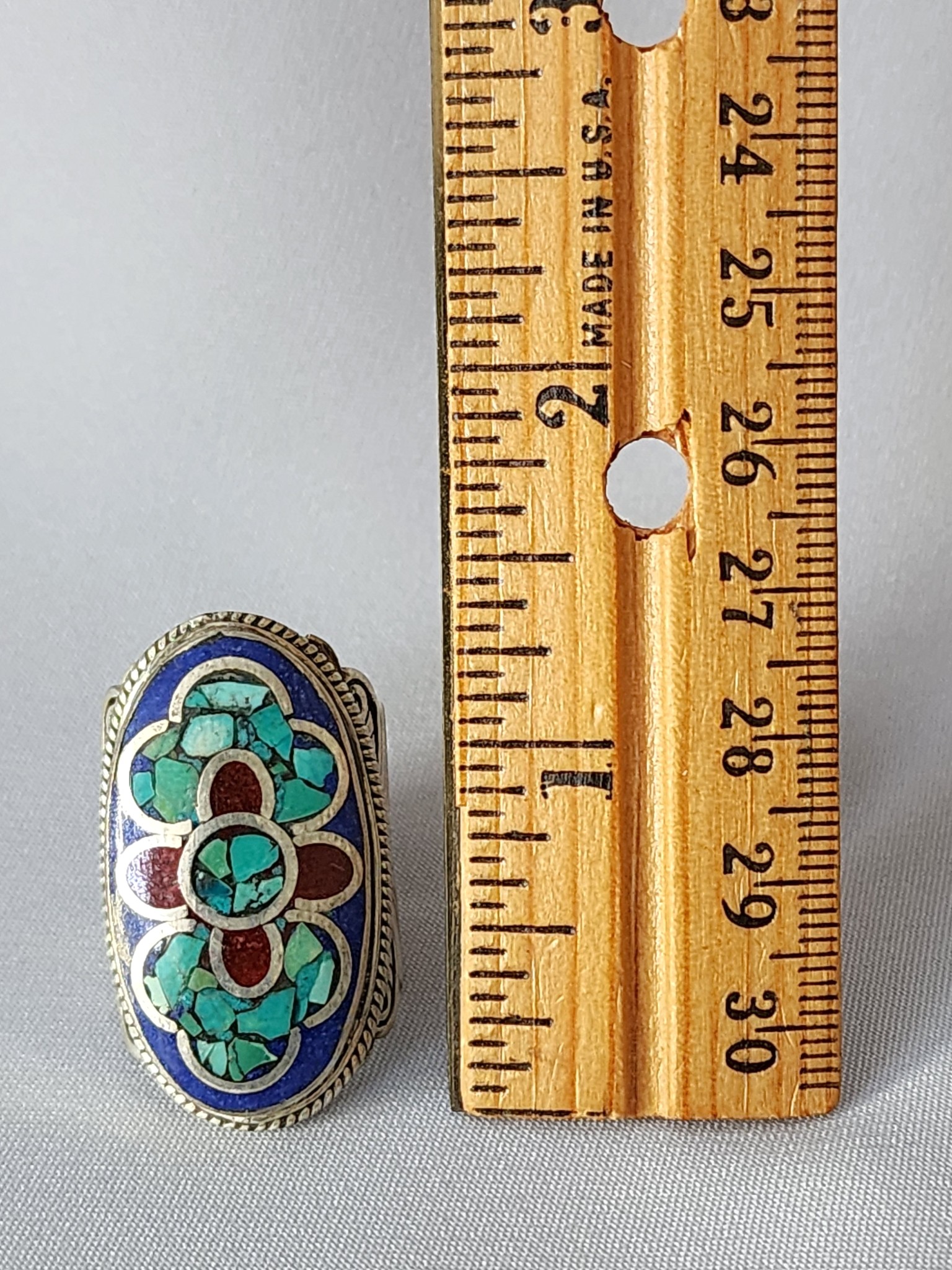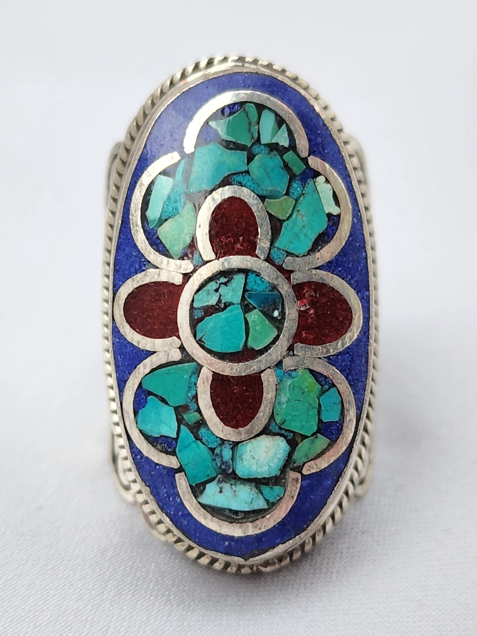 Keywords: Tibetan lapis turquoise ring, Nepal mosaic inlay ring, lapis lazuli statement ring, Himalayan flower ring, turquoise coral lapis ring, Nepalese silver ring, ethnic boho gemstone ring, Himalayan jewelry, crushed turquoise inlay ring, multi-stone Tibetan ring