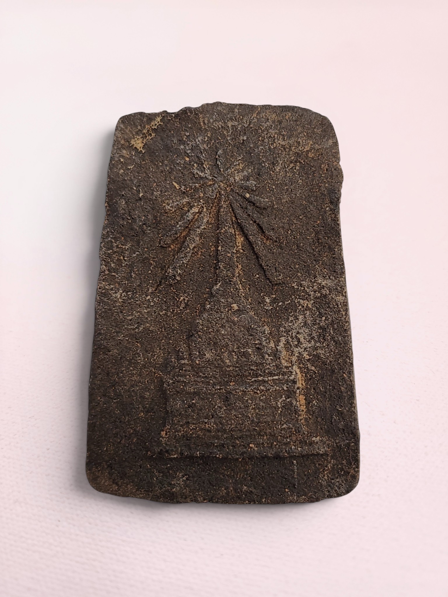 Raw, powerful, and steeped in sacred tradition, this Luang Pu Thuat amulet is pressed in dark sacred clay and presents one of Thailand’s most revered and widely venerated monk figures in bold relief. The front depicts LP Tuad seated within an arched frame in his characteristic posture — robes highlighted with applied gold paint that catches the light against the naturally textured clay surface, lending the piece a striking visual contrast that speaks to active devotional use. The reverse carries an incised stupa or chedi rising from a tiered base with radiating lines above — a classic Buddhist reliquary symbol representing enlightenment, the Buddha’s presence, and spiritual merit.