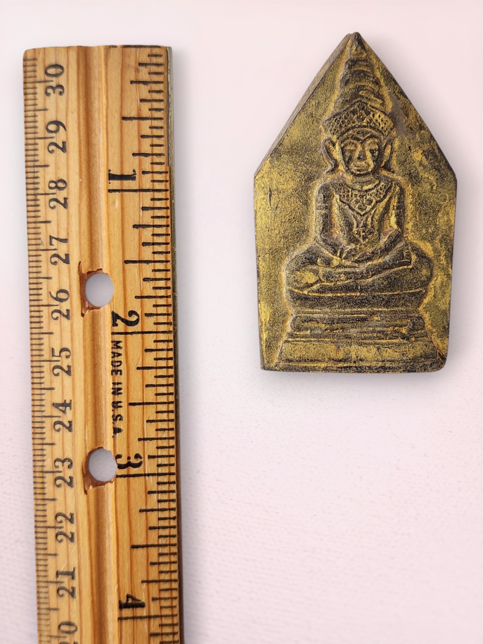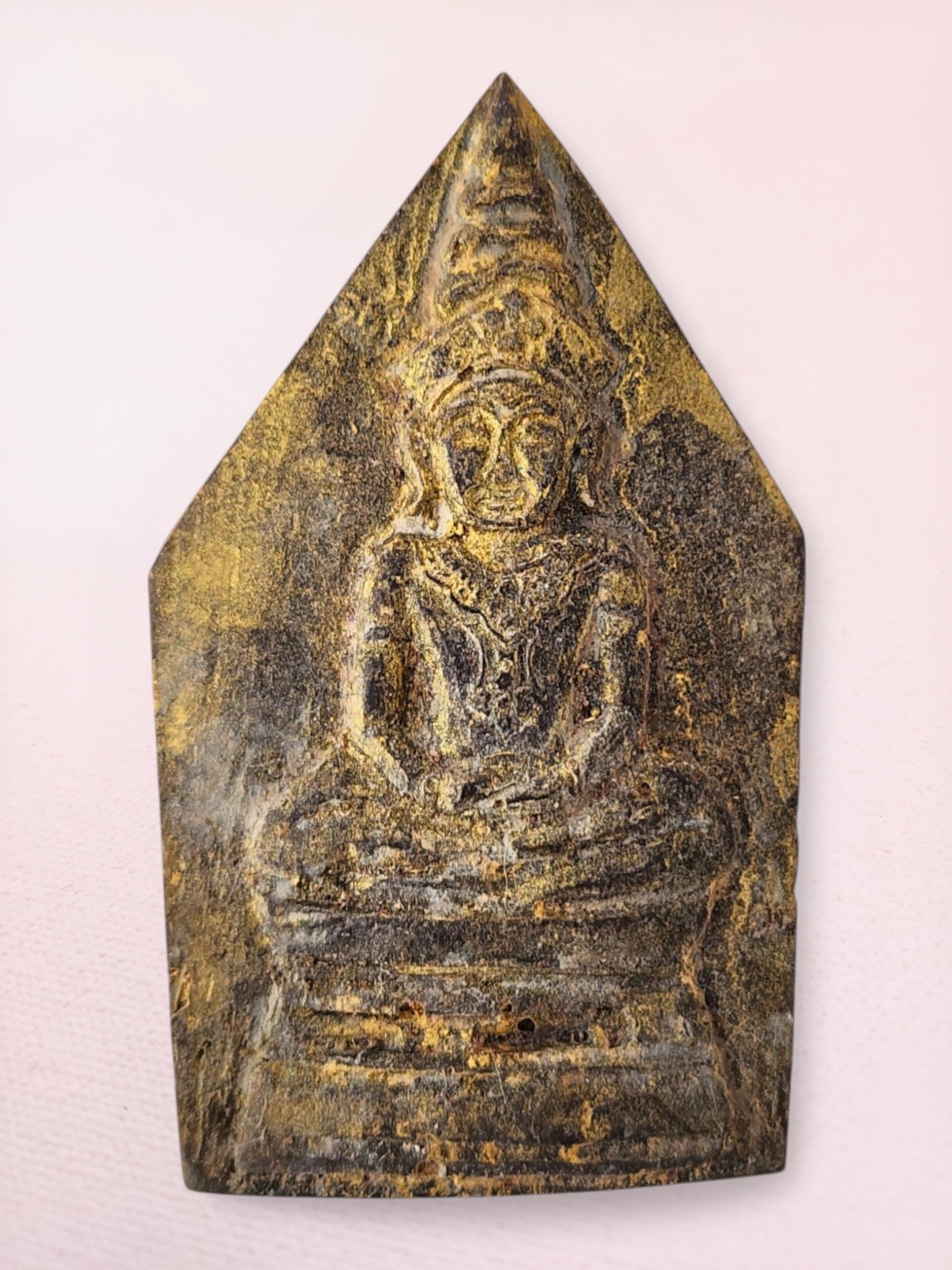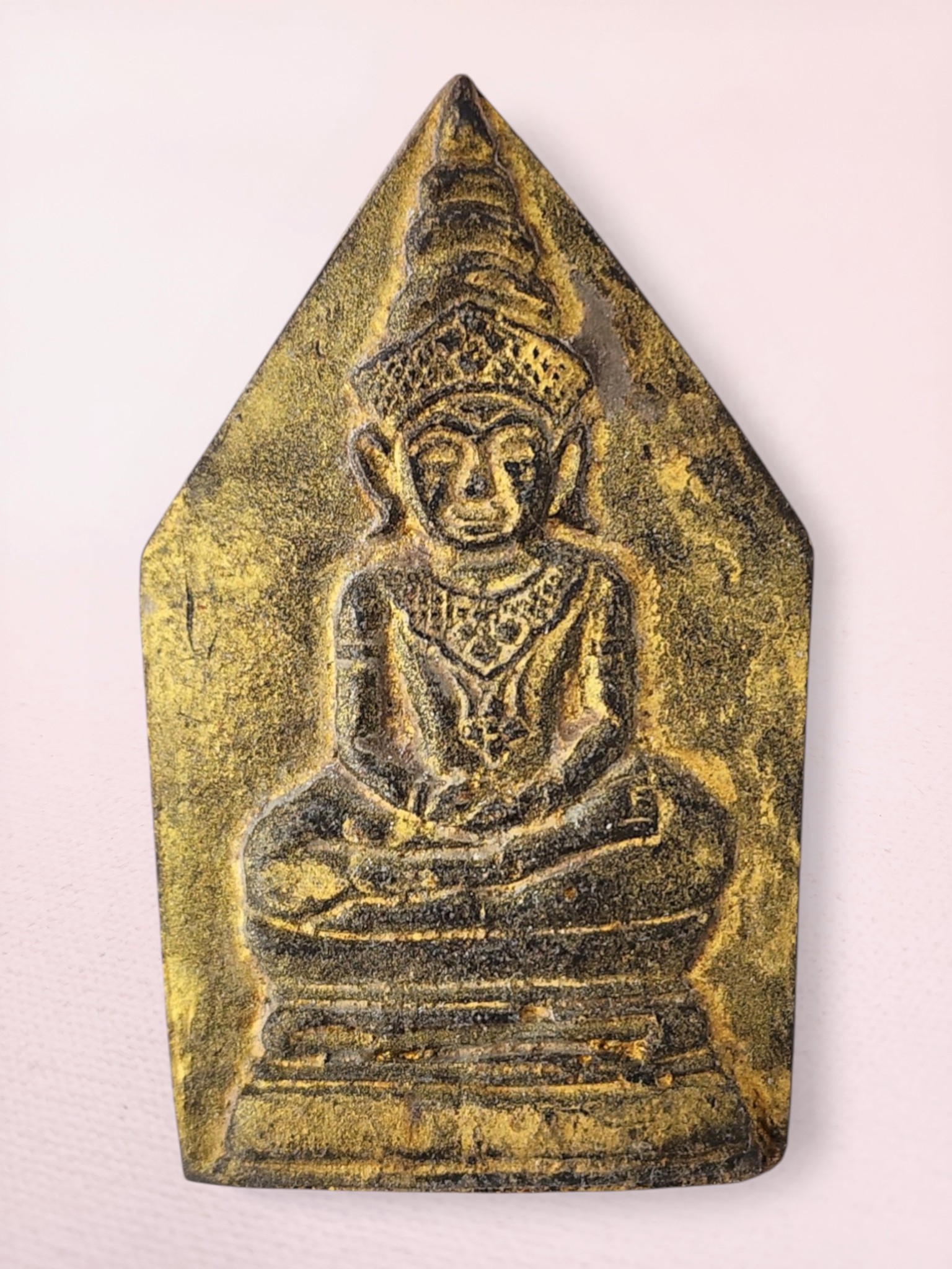The warm golden tones against darker recessed areas create dimensional depth, revealing Buddha’s peaceful expression, hand mudras, and elaborate throne details. Buddha image and gold paint appear on both sides of amulet. Natural age patina and gentle paint wear confirm authentic temple consecration and use.