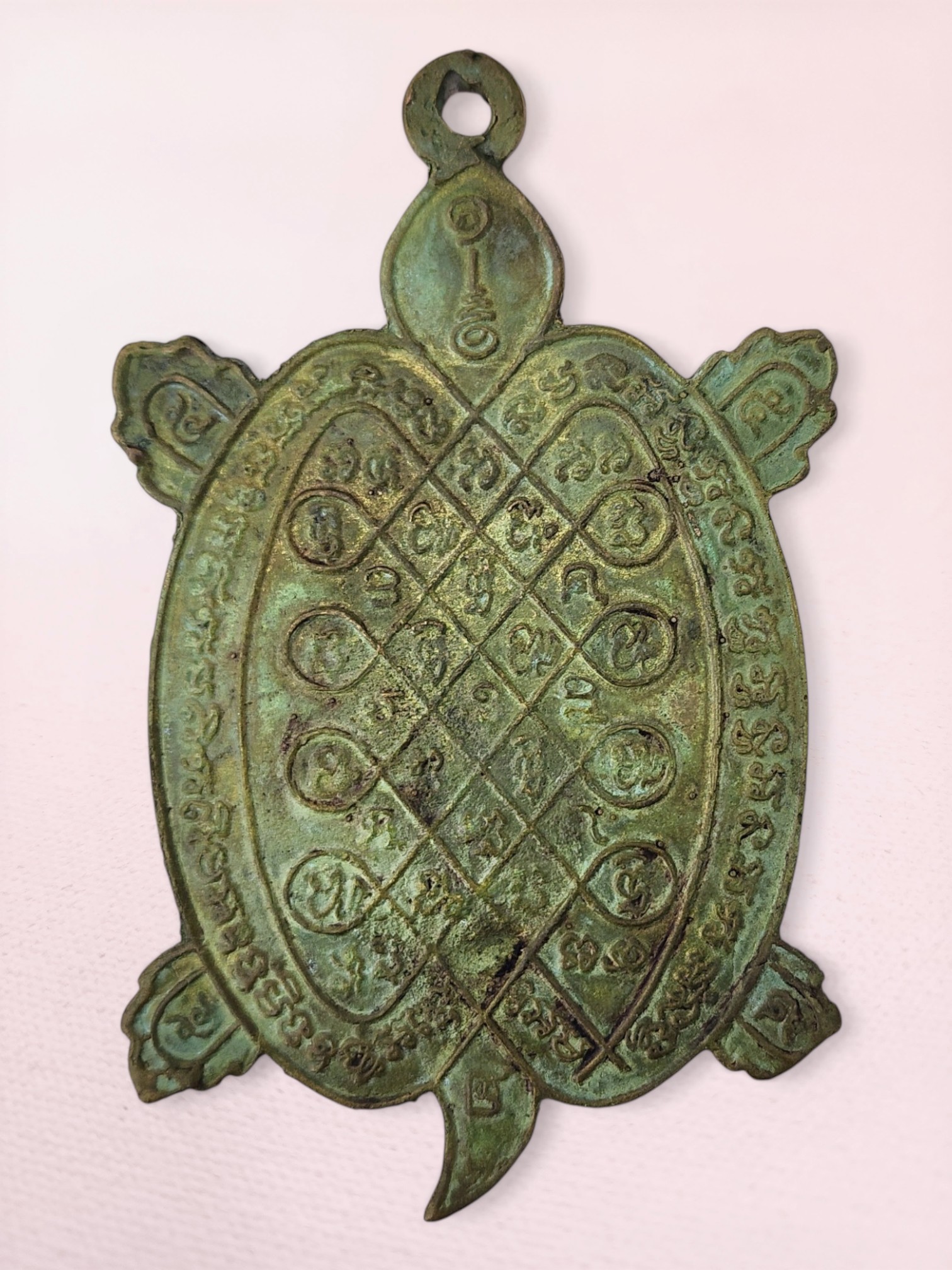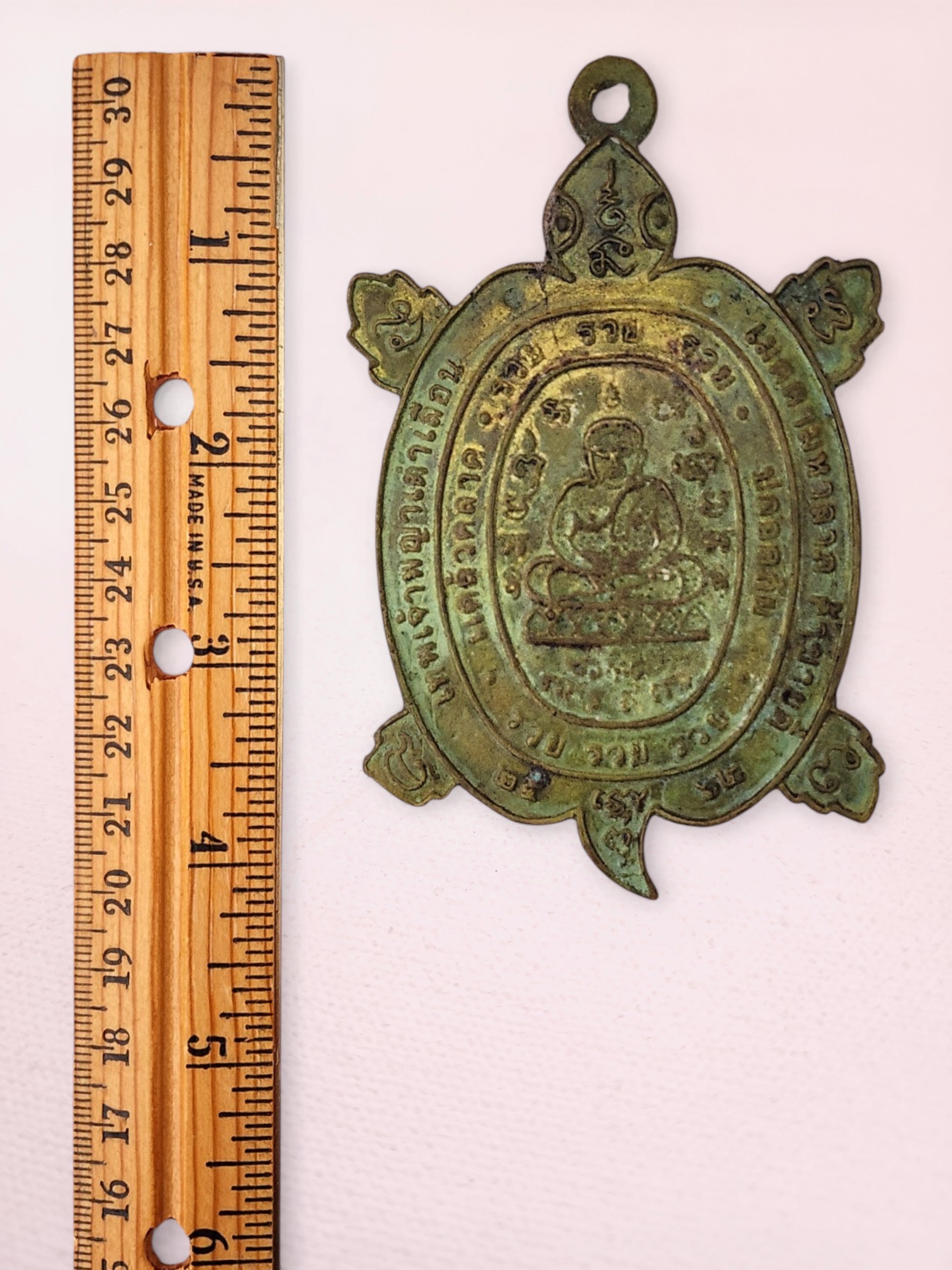 Keywords: Phra Tao Ruean, Thai turtle amulet, large Buddhist pendant, brass tortoise Yantra, sak yant, green patina wall hanging, longevity protection charm, Thai monk amulet, Phaya Tao Ruen, Roon, LP Ruam, Palung, Lord Turtle