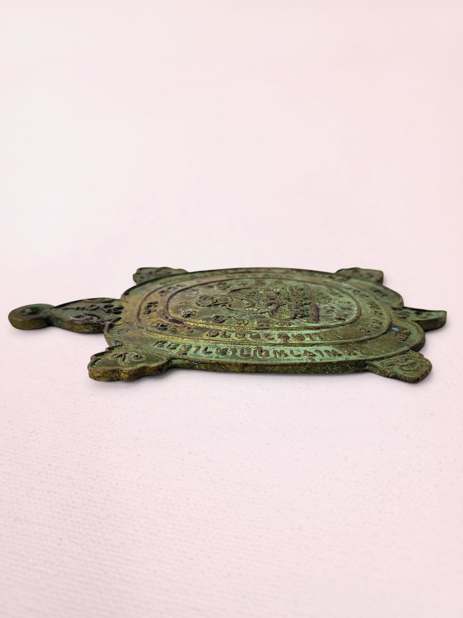 Heavy Brass Turtle Amulet with Green Patina – Monk Blessing & Yantra Protection