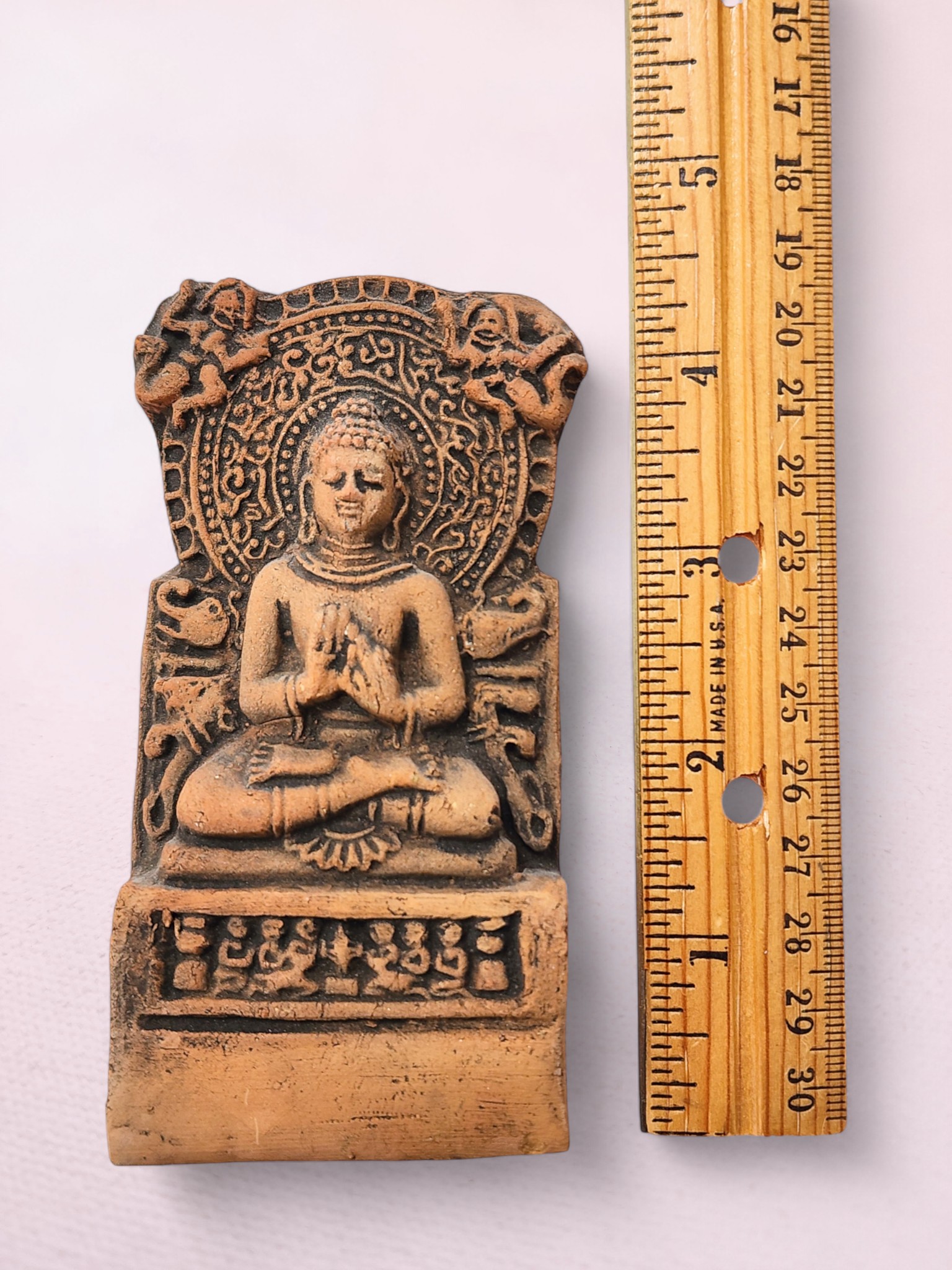 This intricately detailed terracotta Buddha statue is crafted from sacred clay sourced from Sarnath, India, one of the holiest Buddhist pilgrimage sites where the Buddha delivered his first sermon. The statue features the Buddha seated in dharmachakra mudra (teaching gesture), surrounded by ornate carvings and celestial figures.