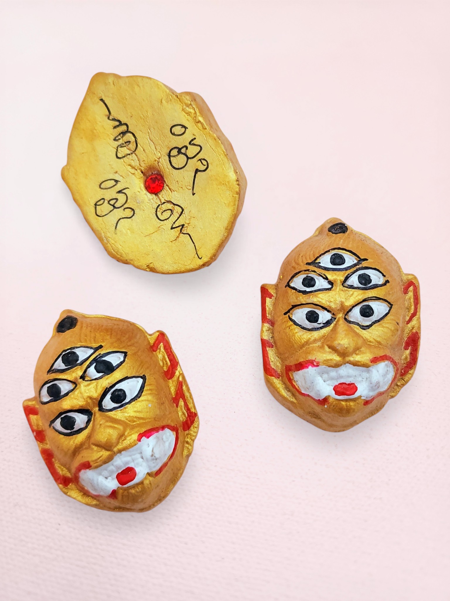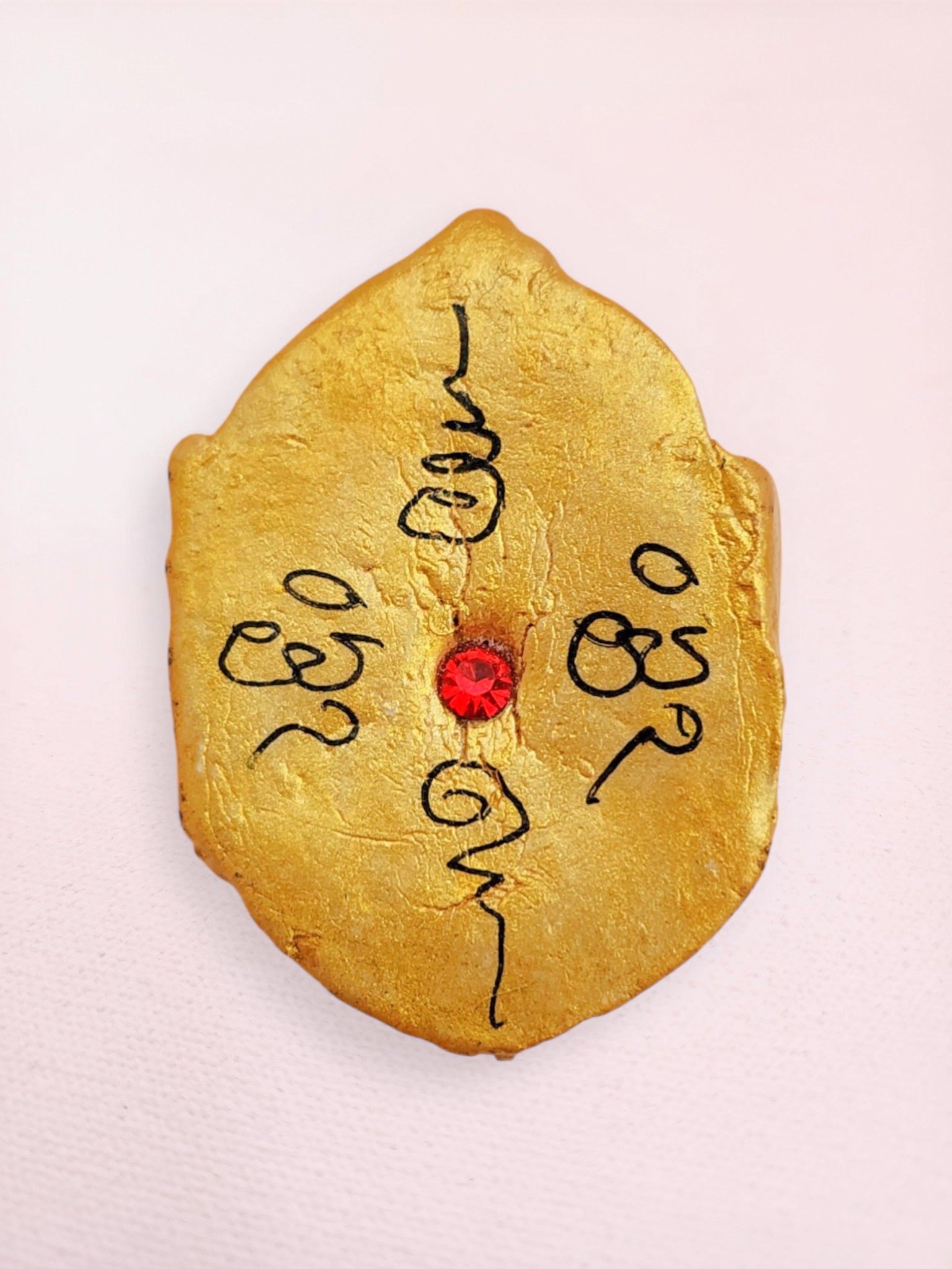 Authentic Sihuhata “Four Ears Five Eyes” Thai Buddhist amulet. Sacred hand-painted gold protection talisman with red crystal and mystical symbols.