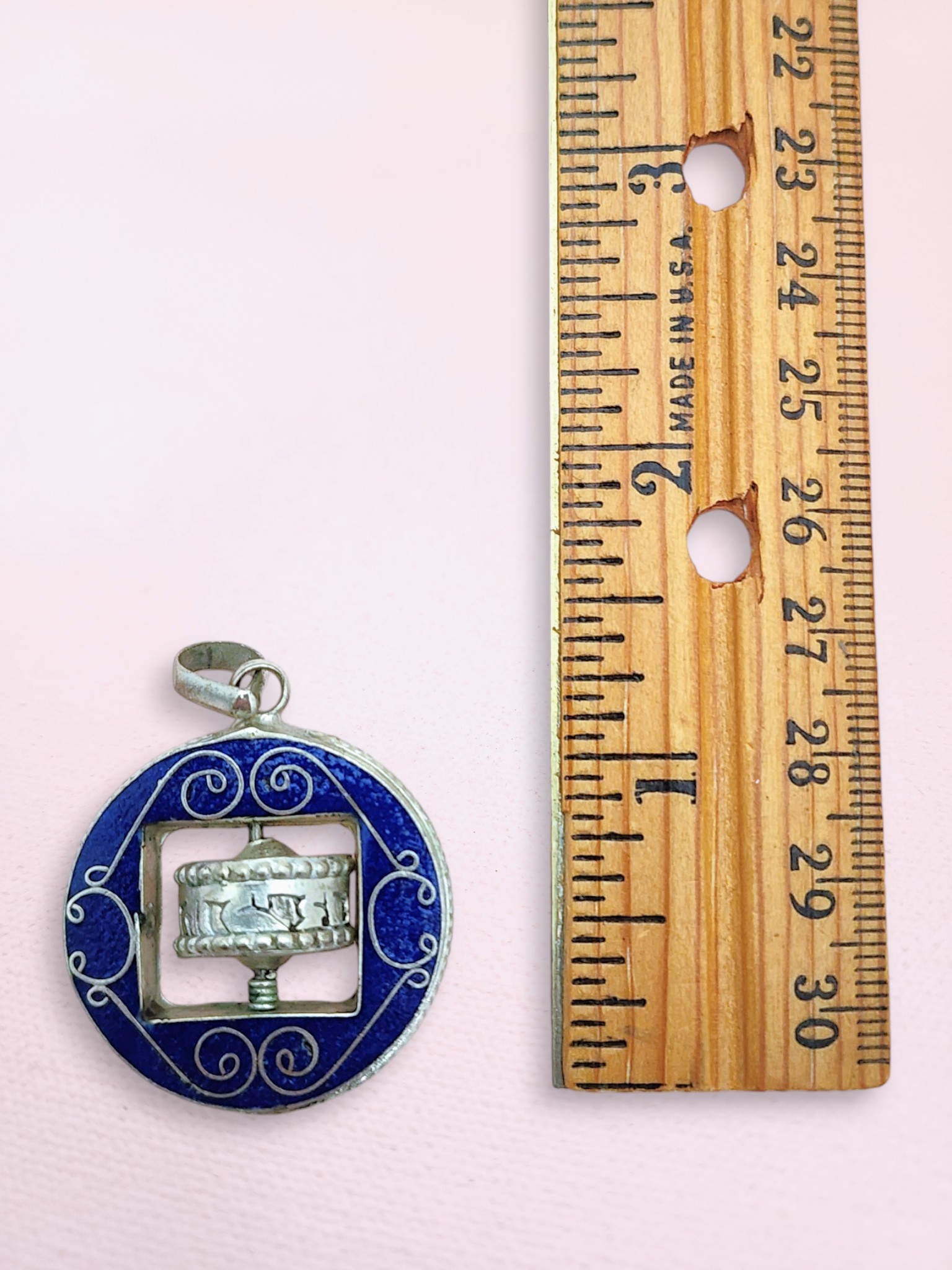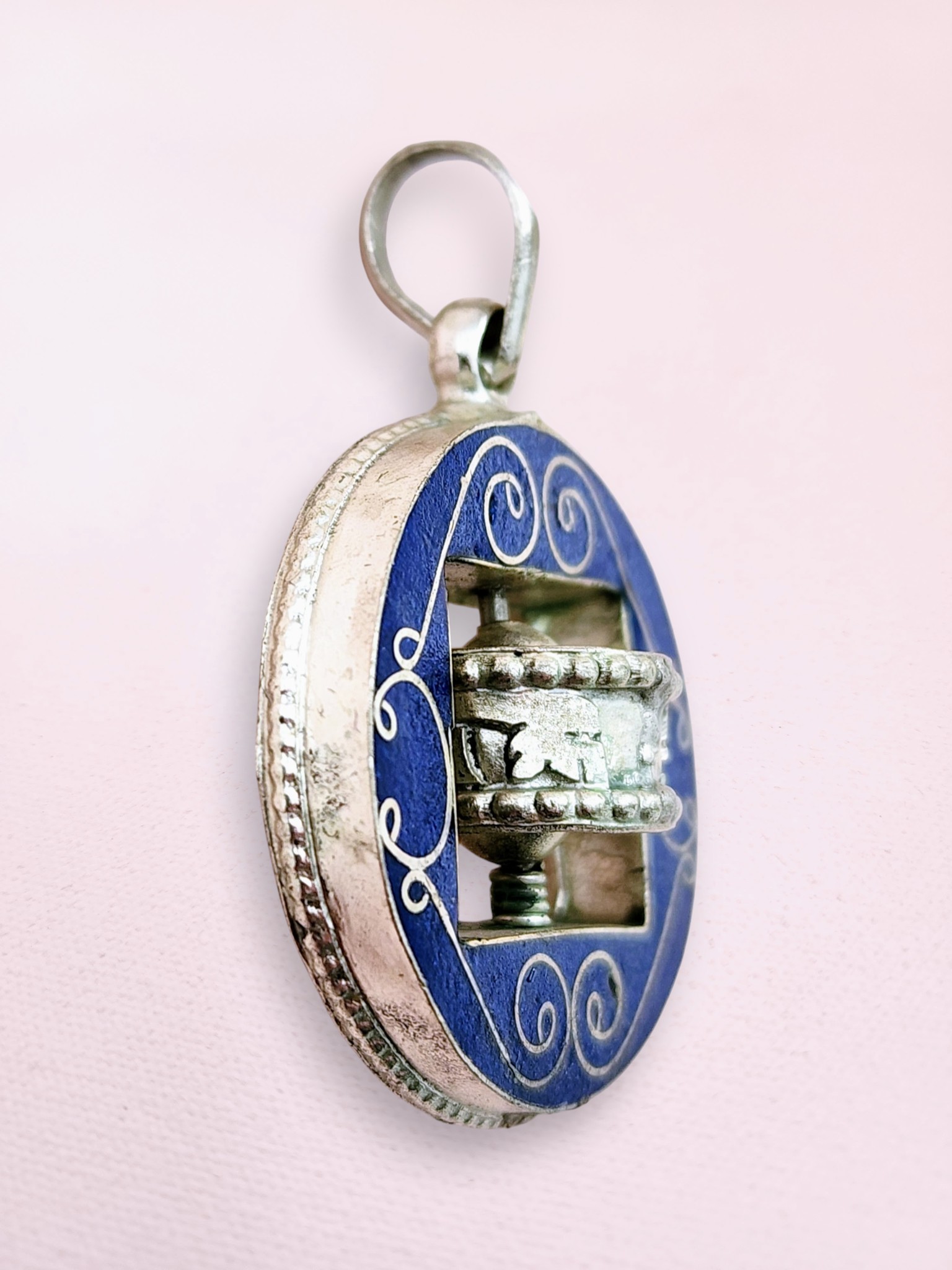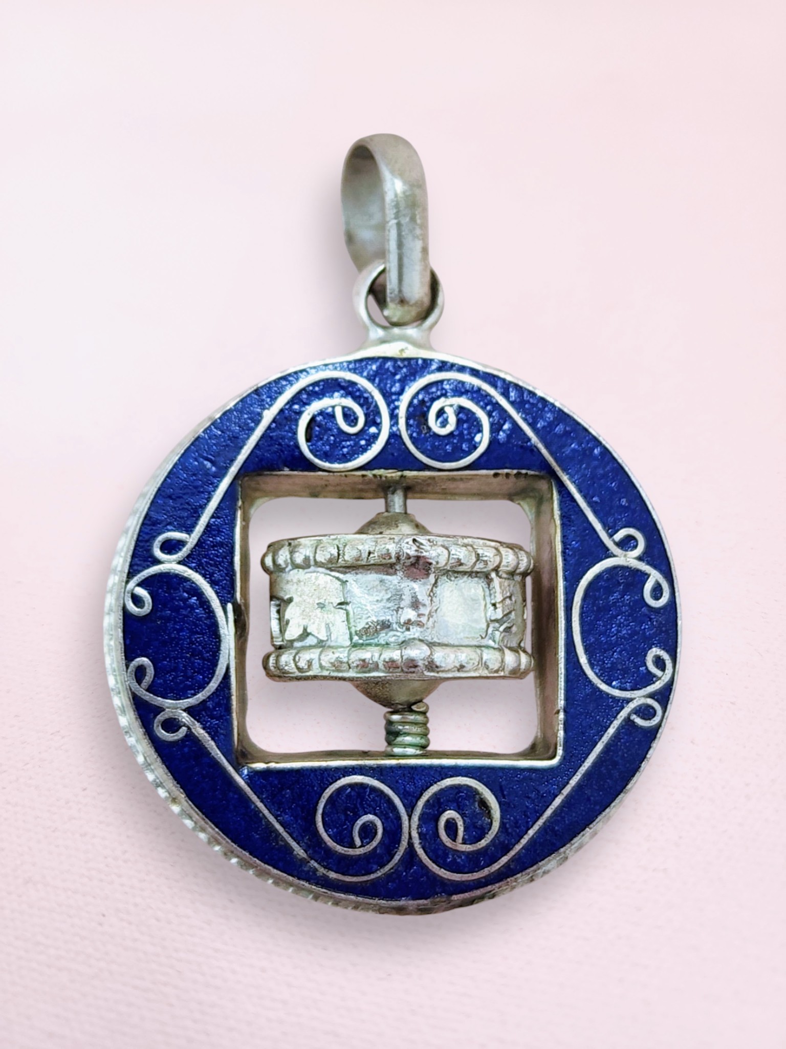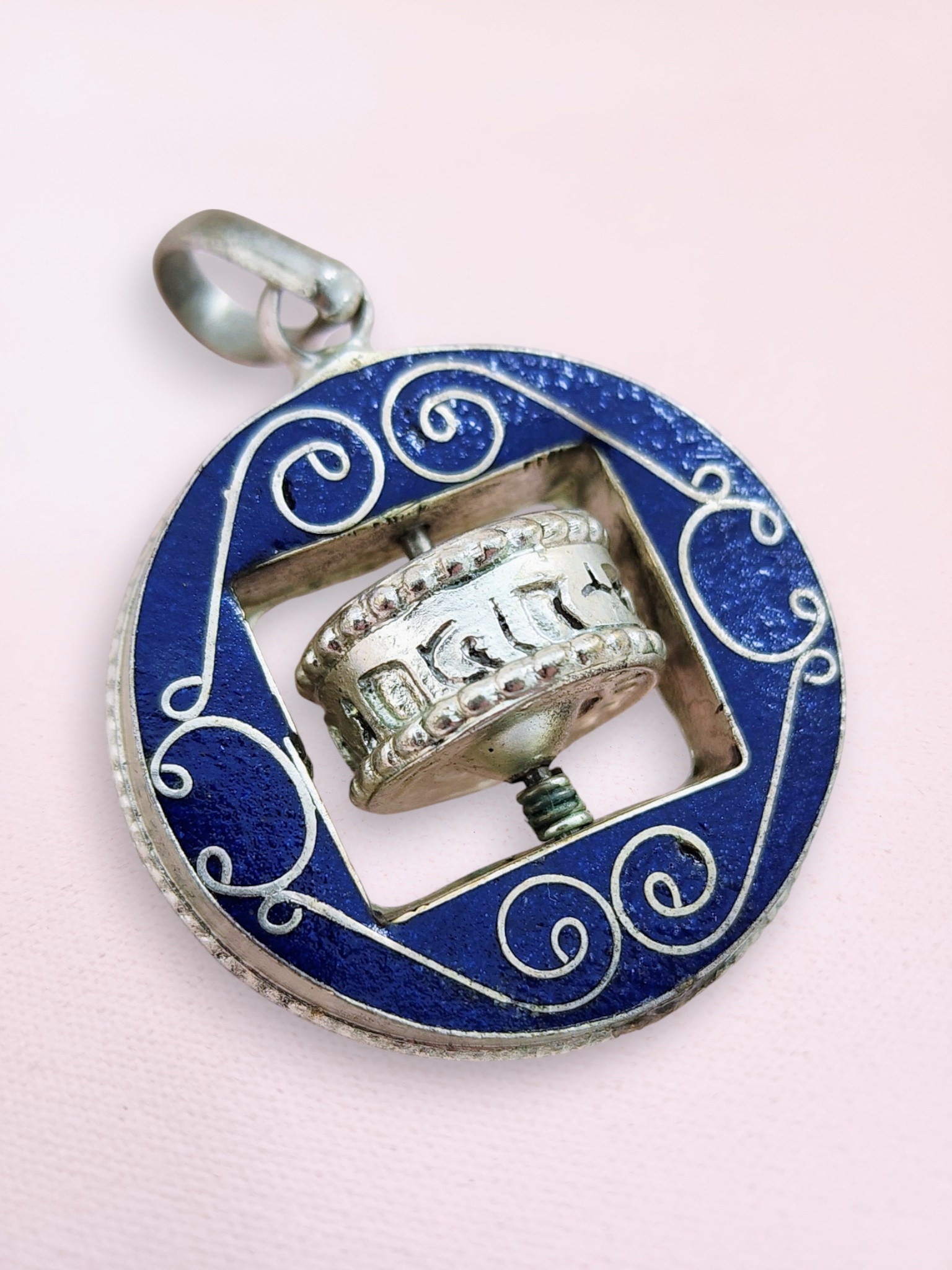 This Spinning Tibetan Prayer Wheel Pendant is a sacred symbol of peace, mindfulness, and spiritual protection. Expertly handcrafted, it features a silver-tone metal prayer wheel encased in a deep blue enamel frame adorned with delicate swirl designs. The wheel spins freely, inscribed with the sacred “Om Mani Padme Hum” mantra—the revered Tibetan Buddhist prayer of compassion—believed to release blessings, purify negative karma, and bring peace with every turn.