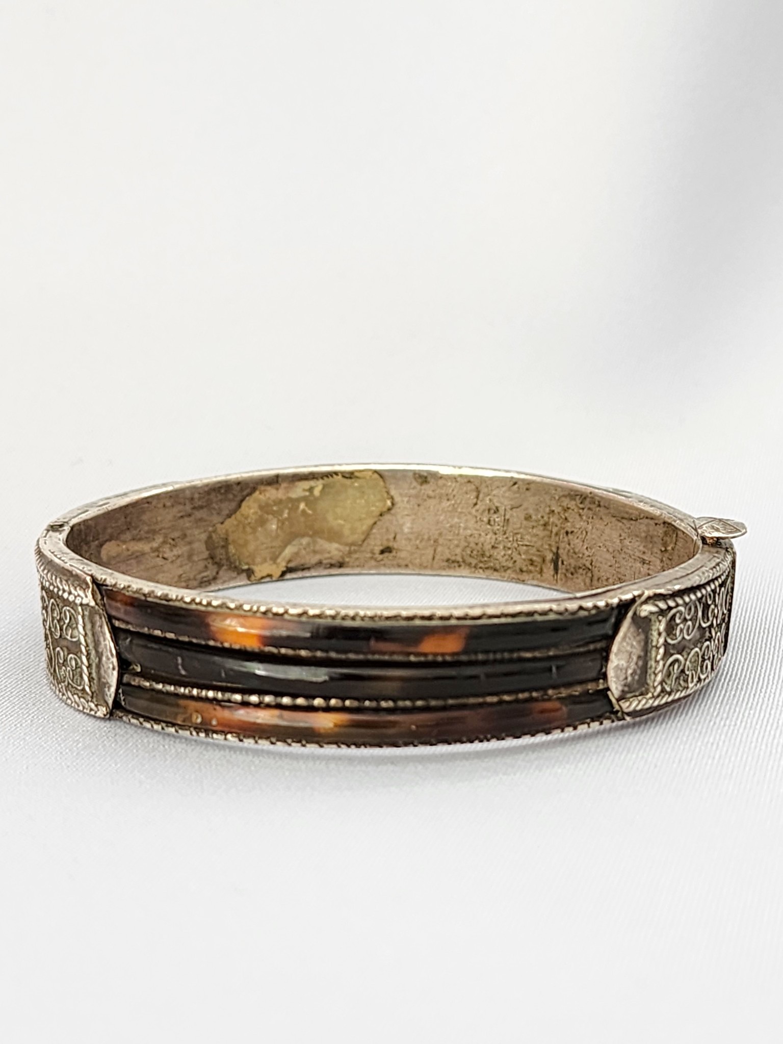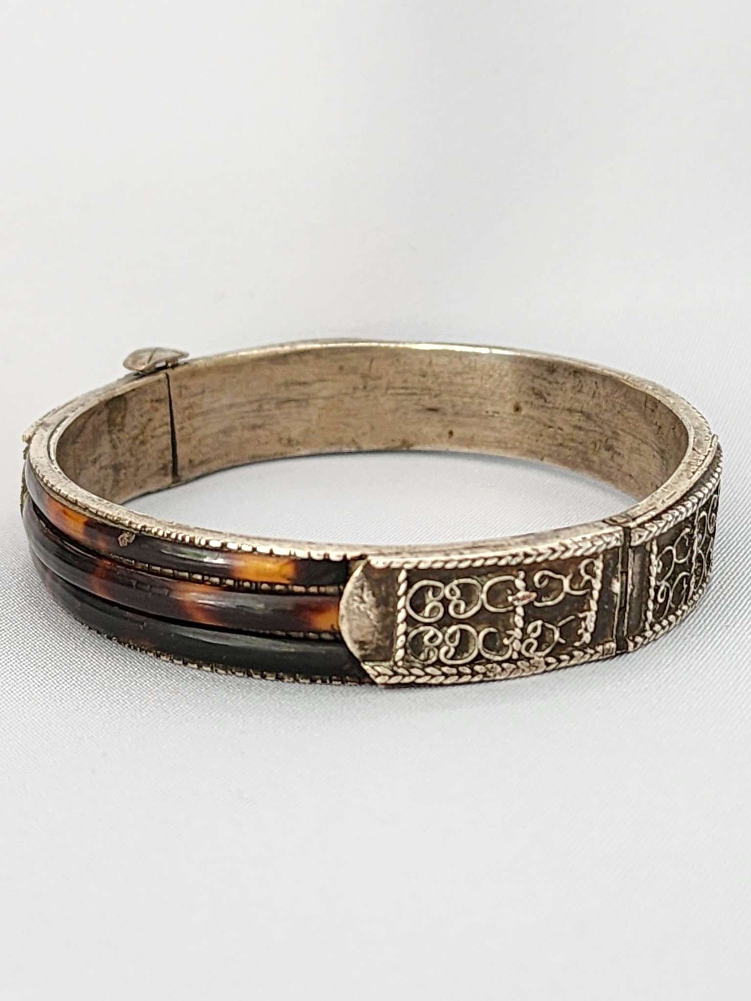 Keywords: vintage tortoise shell bangle, Sri Lankan silver bracelet, antique hinged bangle, tortoiseshell silver cuff, Asian inlay bracelet, vintage Sri Lanka jewelry, antique silver bangle, natural tortoise shell bracelet, turtle shell, engraved silver cuff, South Asian antique jewelry