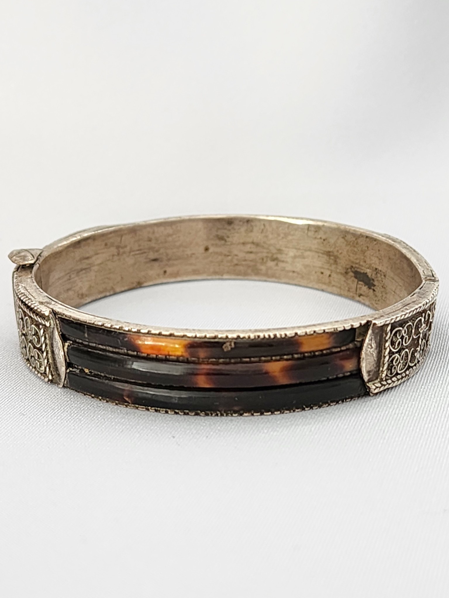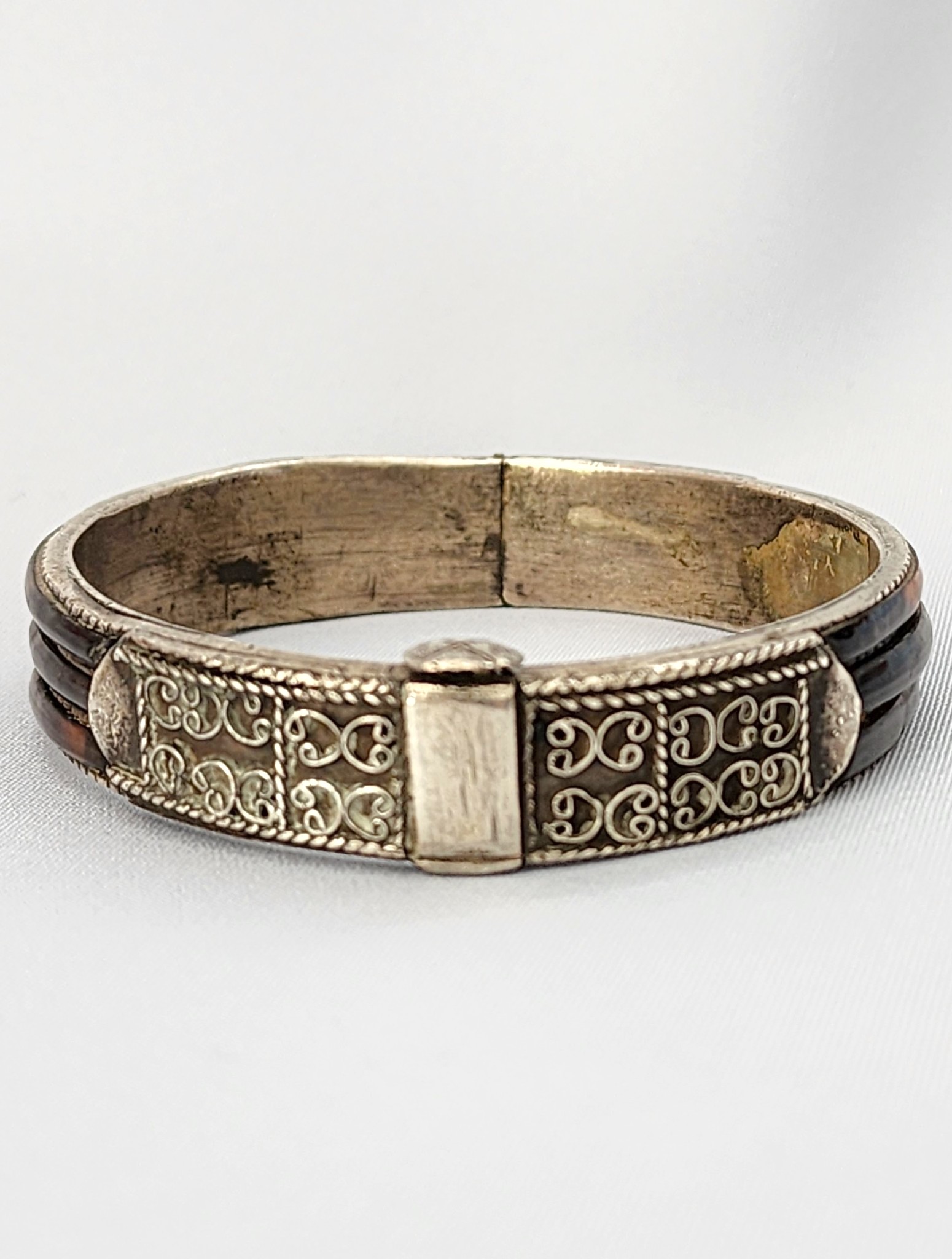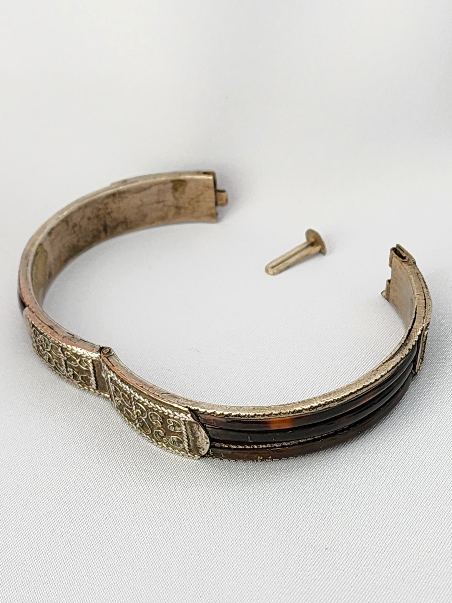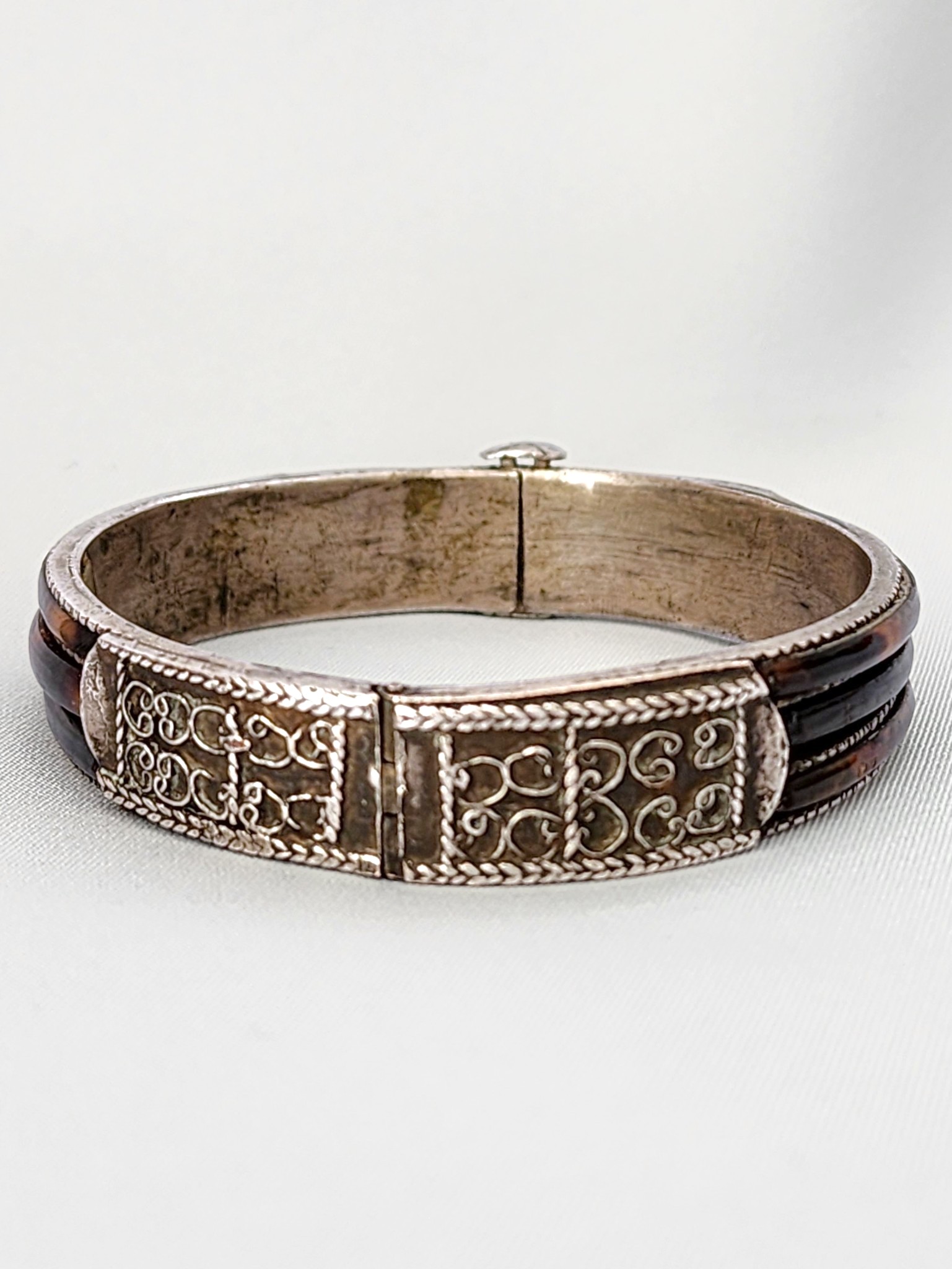 Antique Sri Lankan Silver & Tortoise Shell Bangle Bracelet | Hinged Scroll Engraved Cuff | Antique Asian Inlay Bracelet