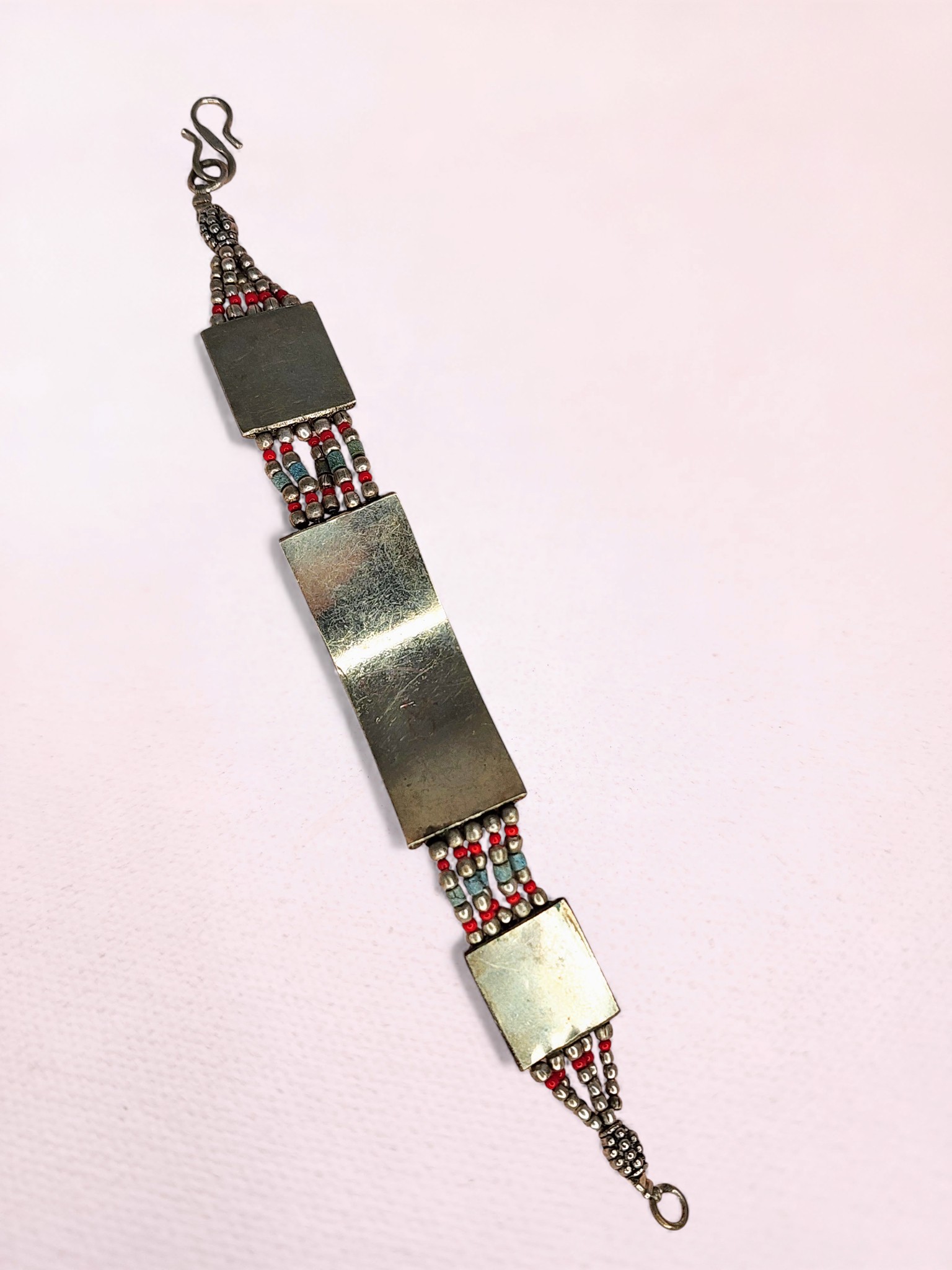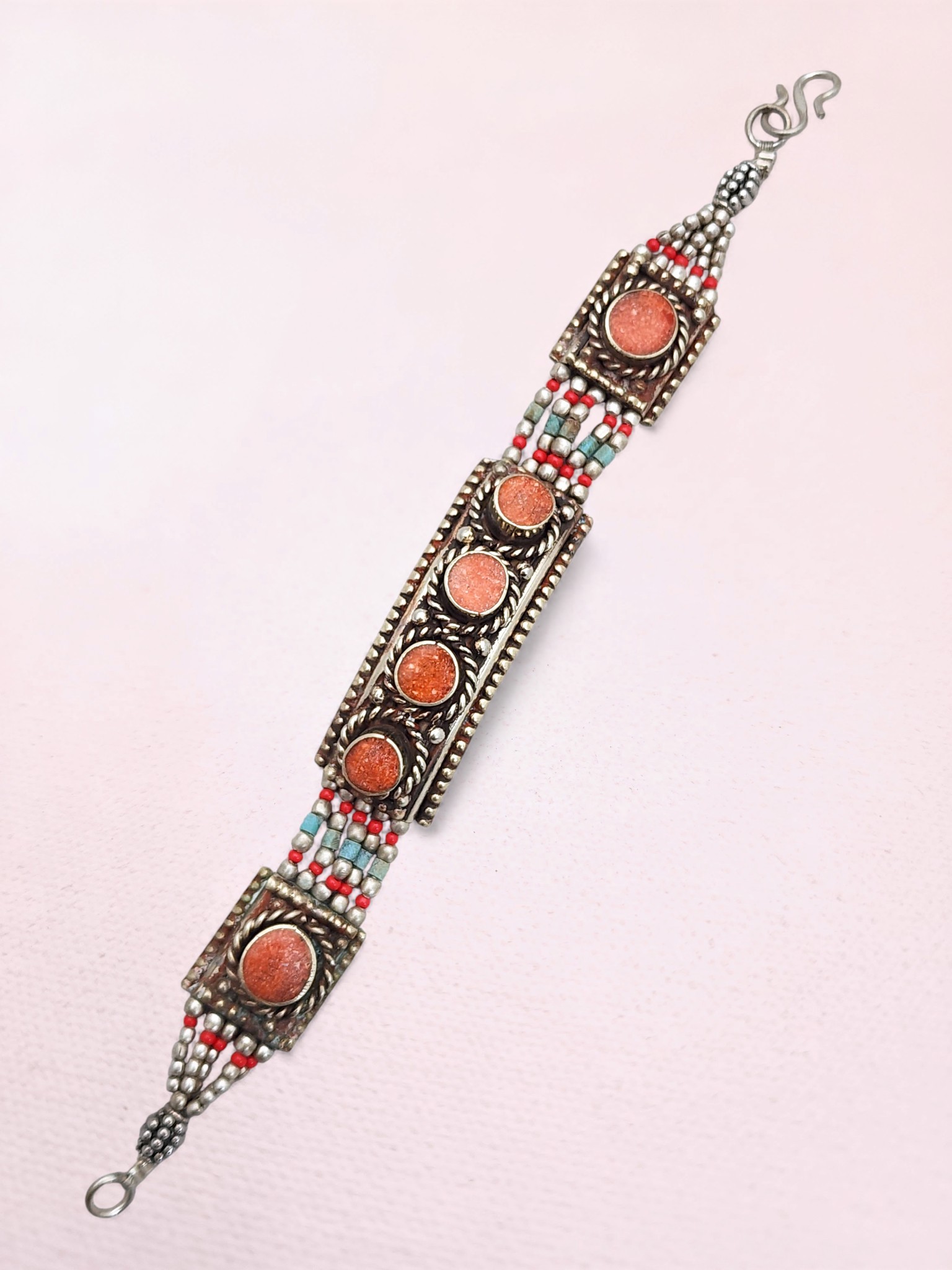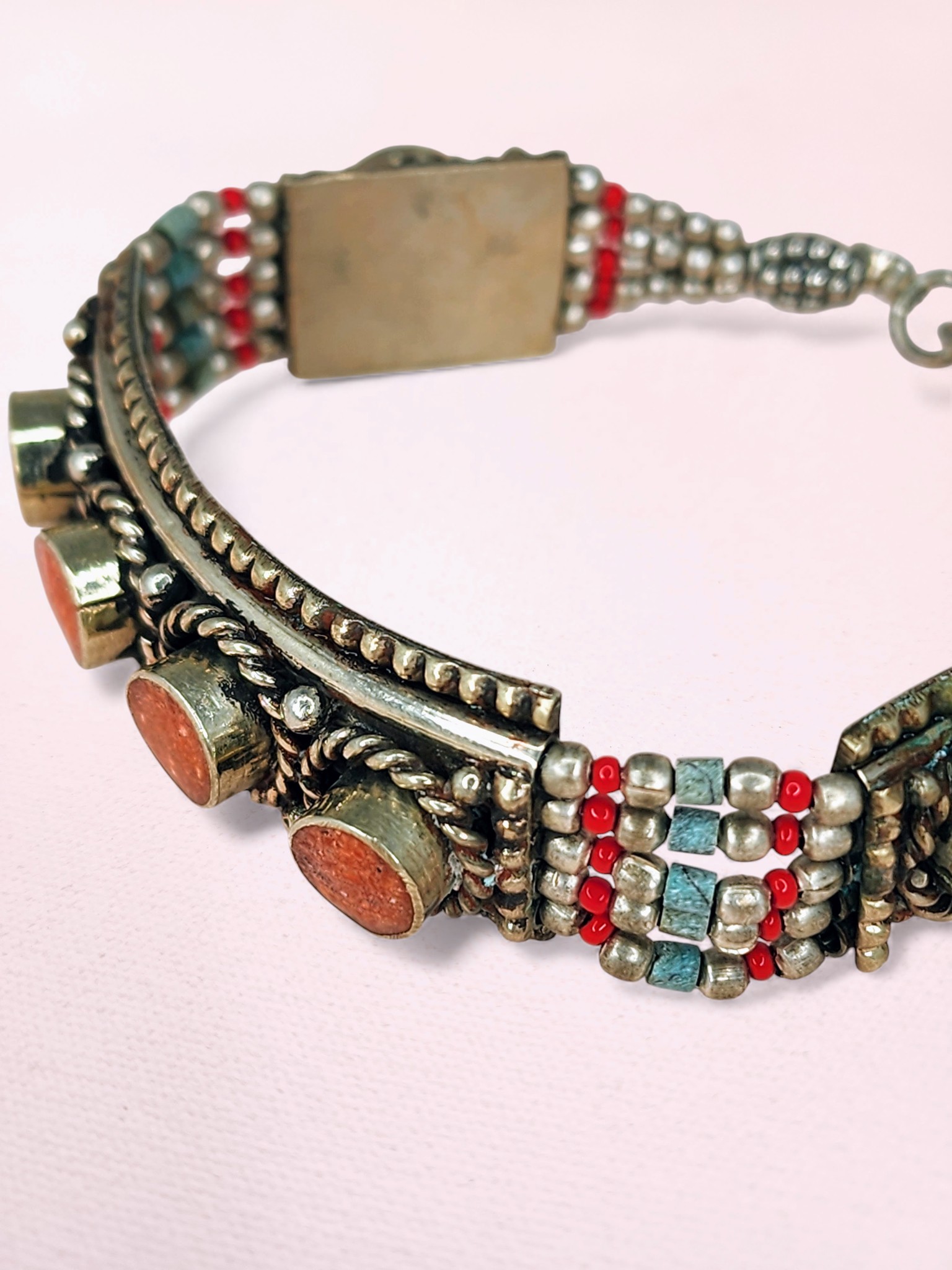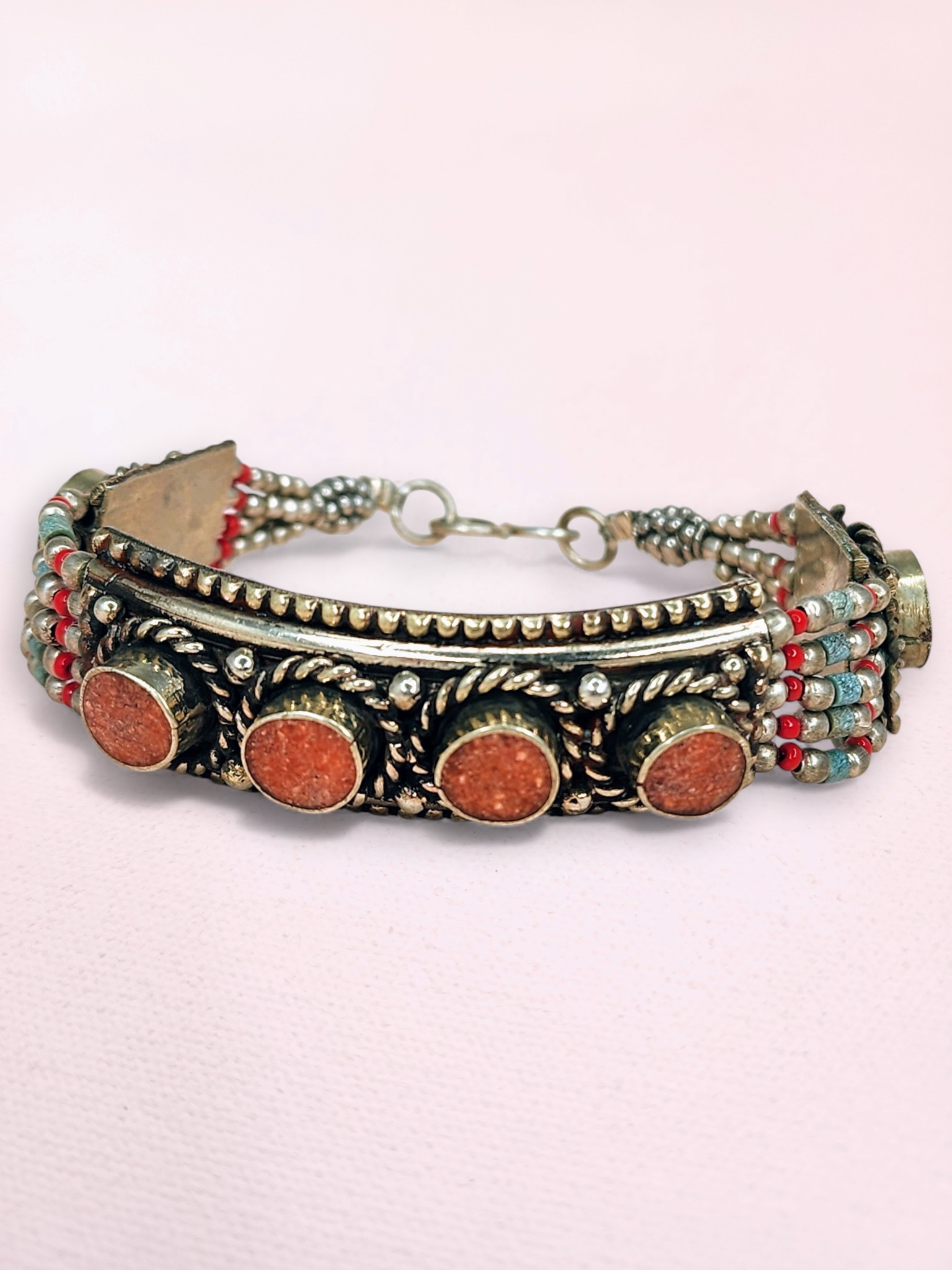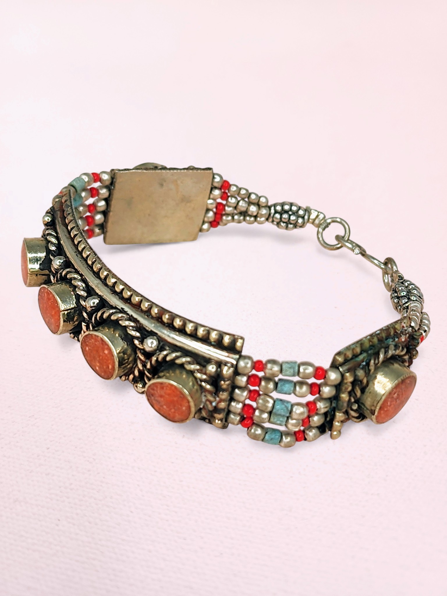 Vintage Tibetan Silver Bracelet – Coral Cabochon Panels with Seed Bead Detail