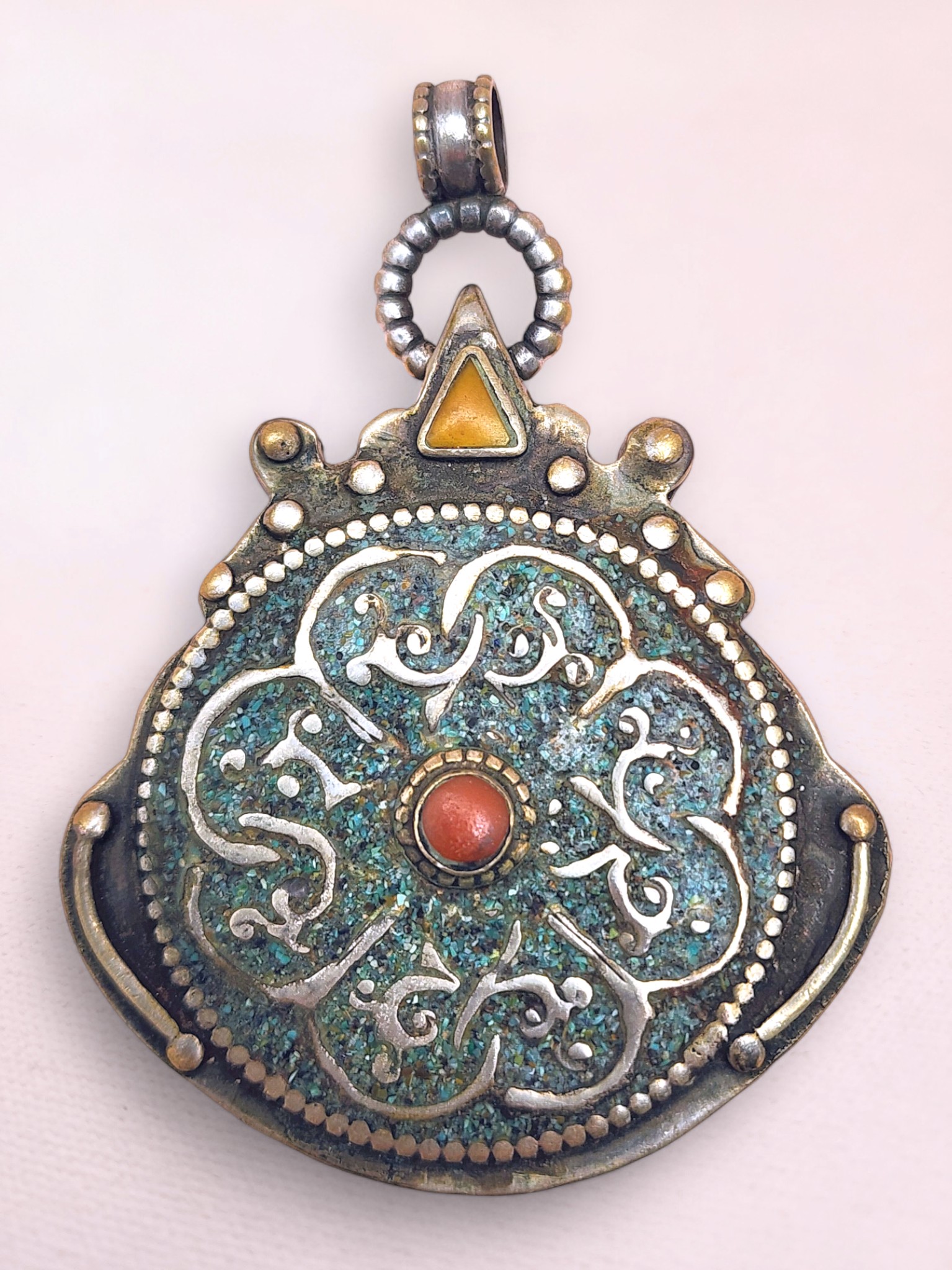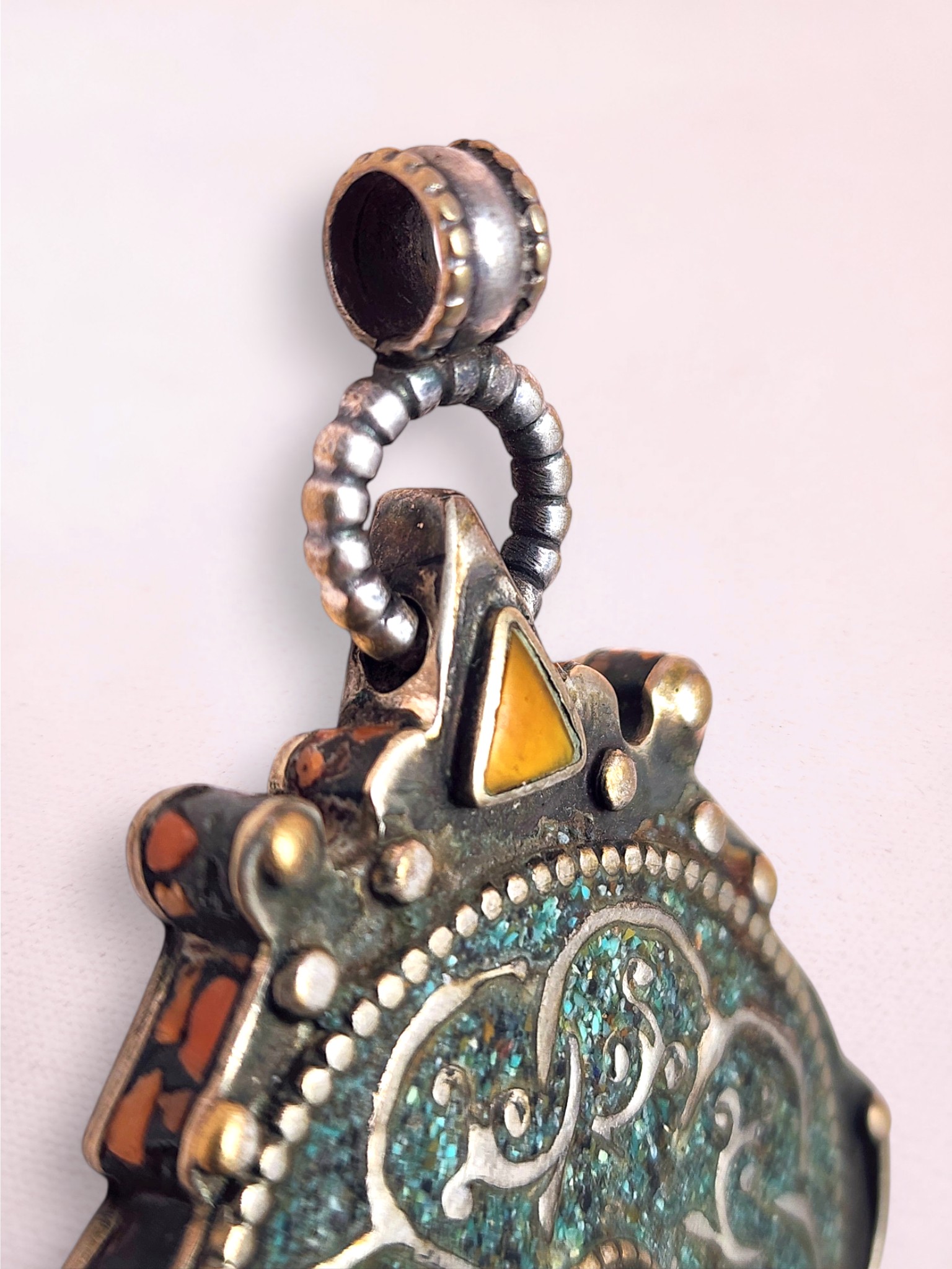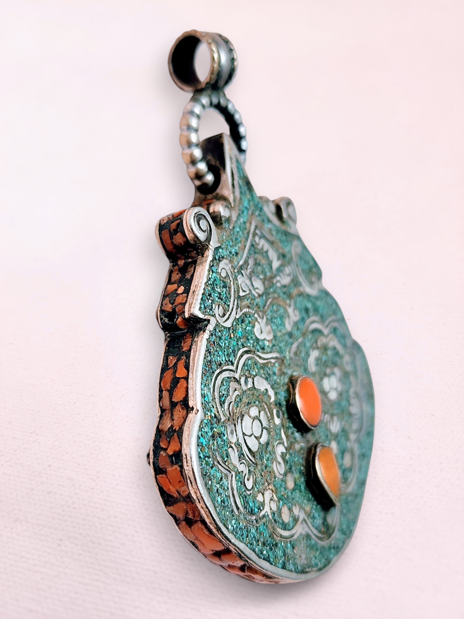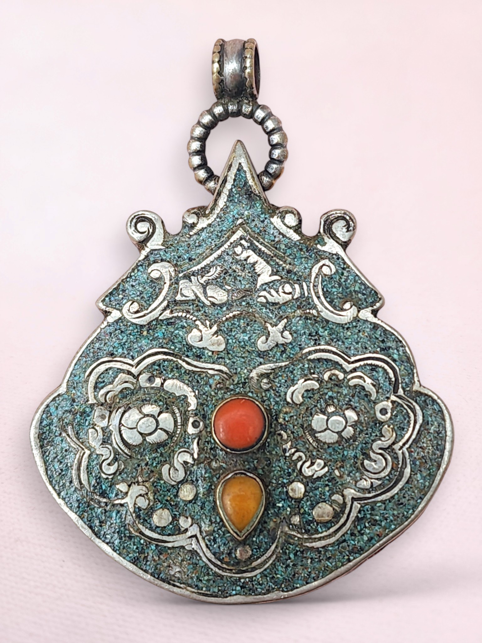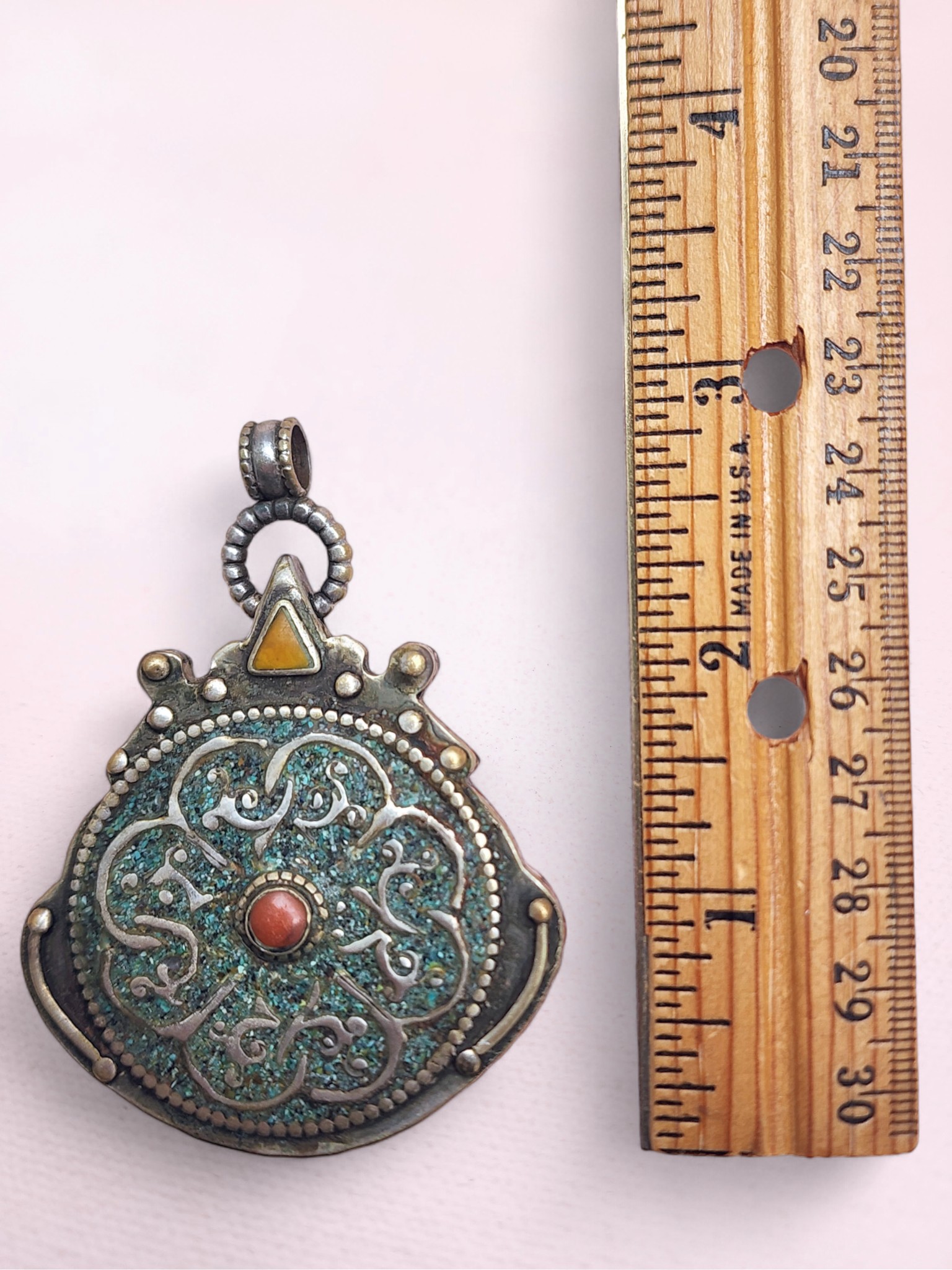 Sterling Silver Tibetan Necklace Pendant with Turquoise, Coral & Amber | Vintage Handmade Gau-style Amulet Shape