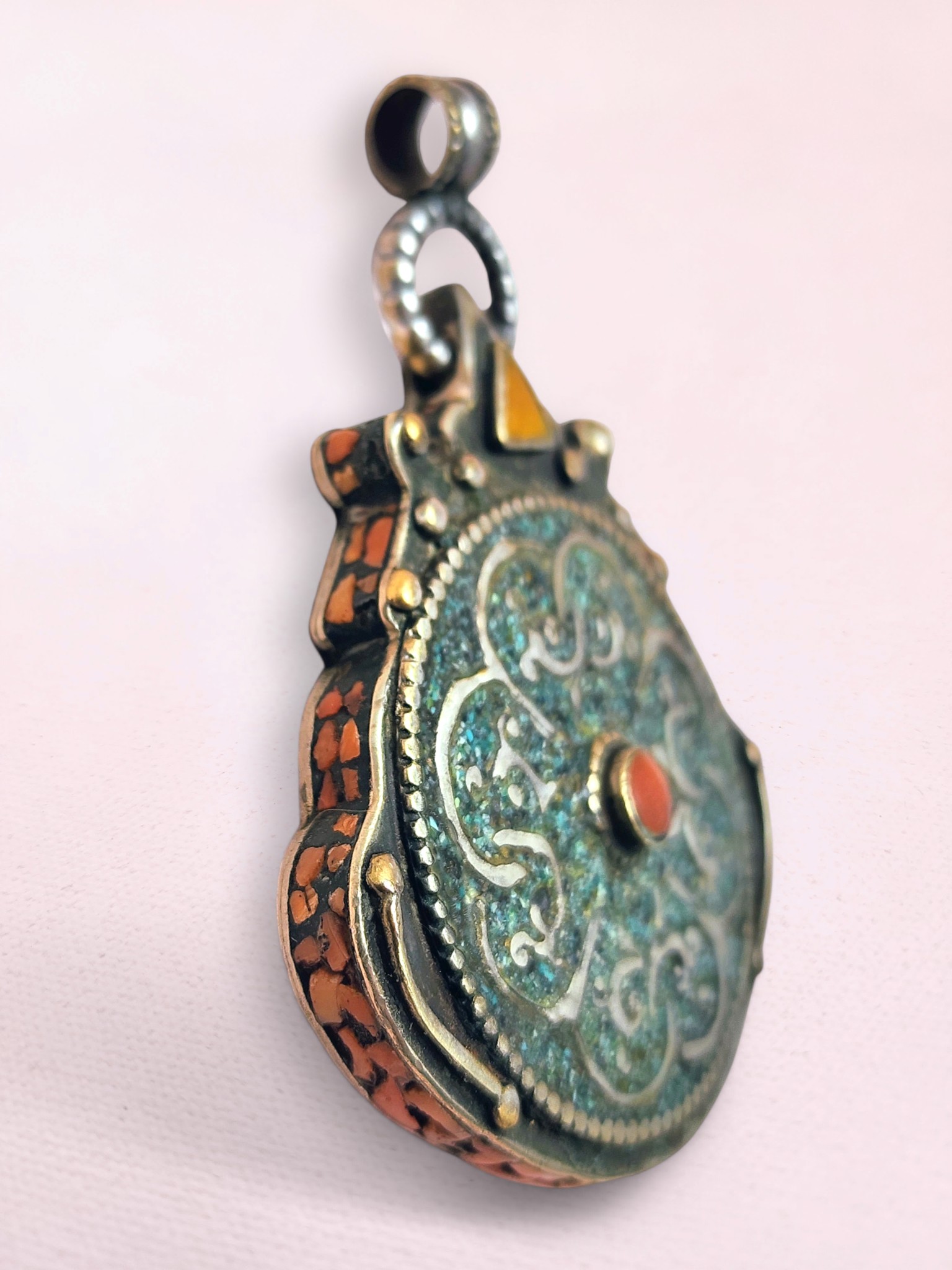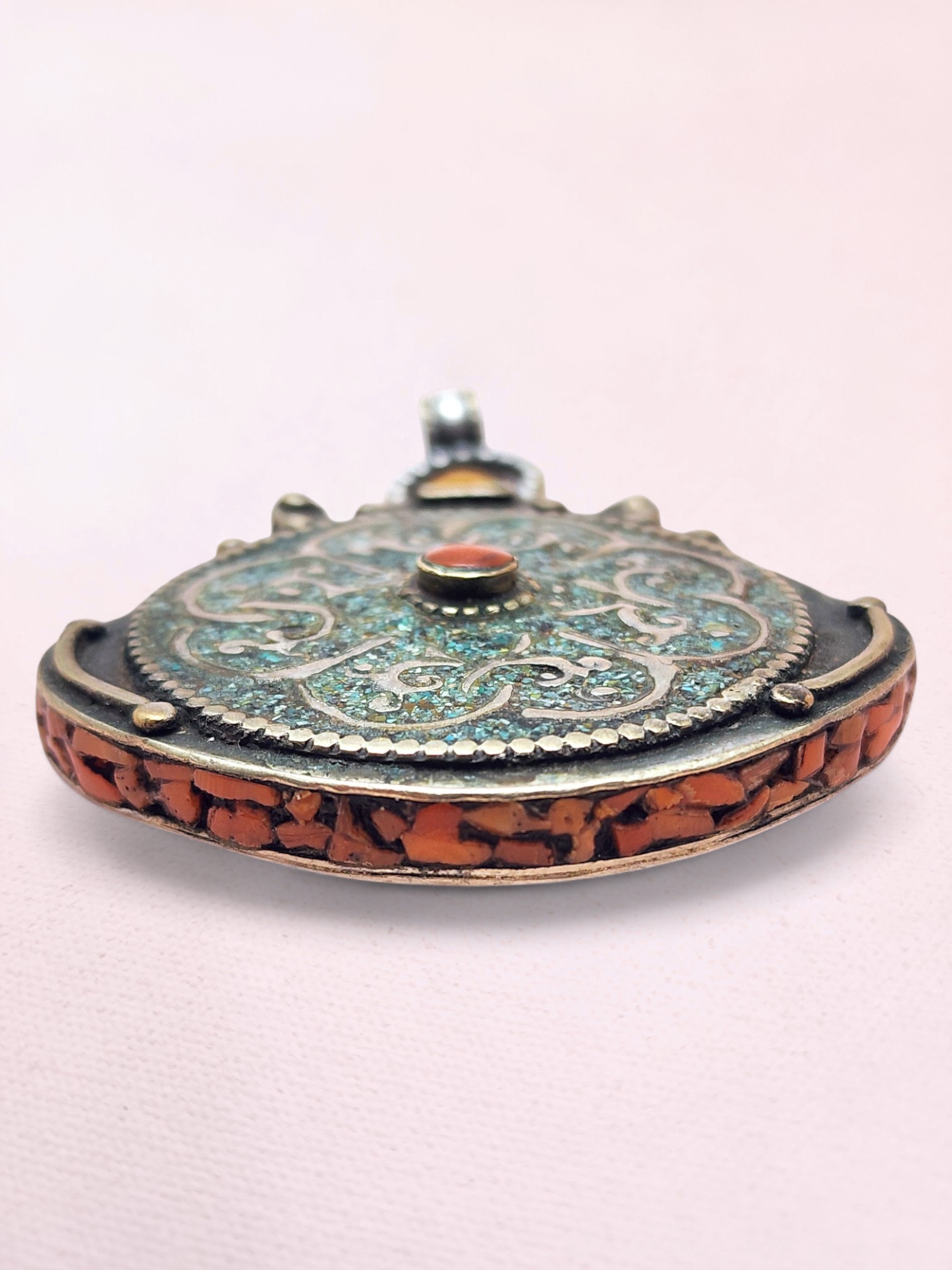 Sterling silver Tibetan pendant with turquoise, coral & amber inlay. Authentic gau-style amulet with sacred symbols. Handcrafted Buddhist jewelry.