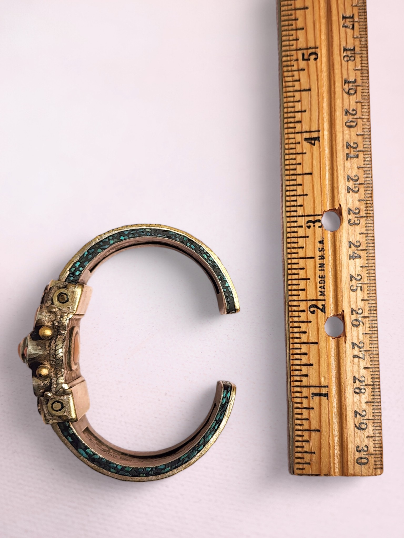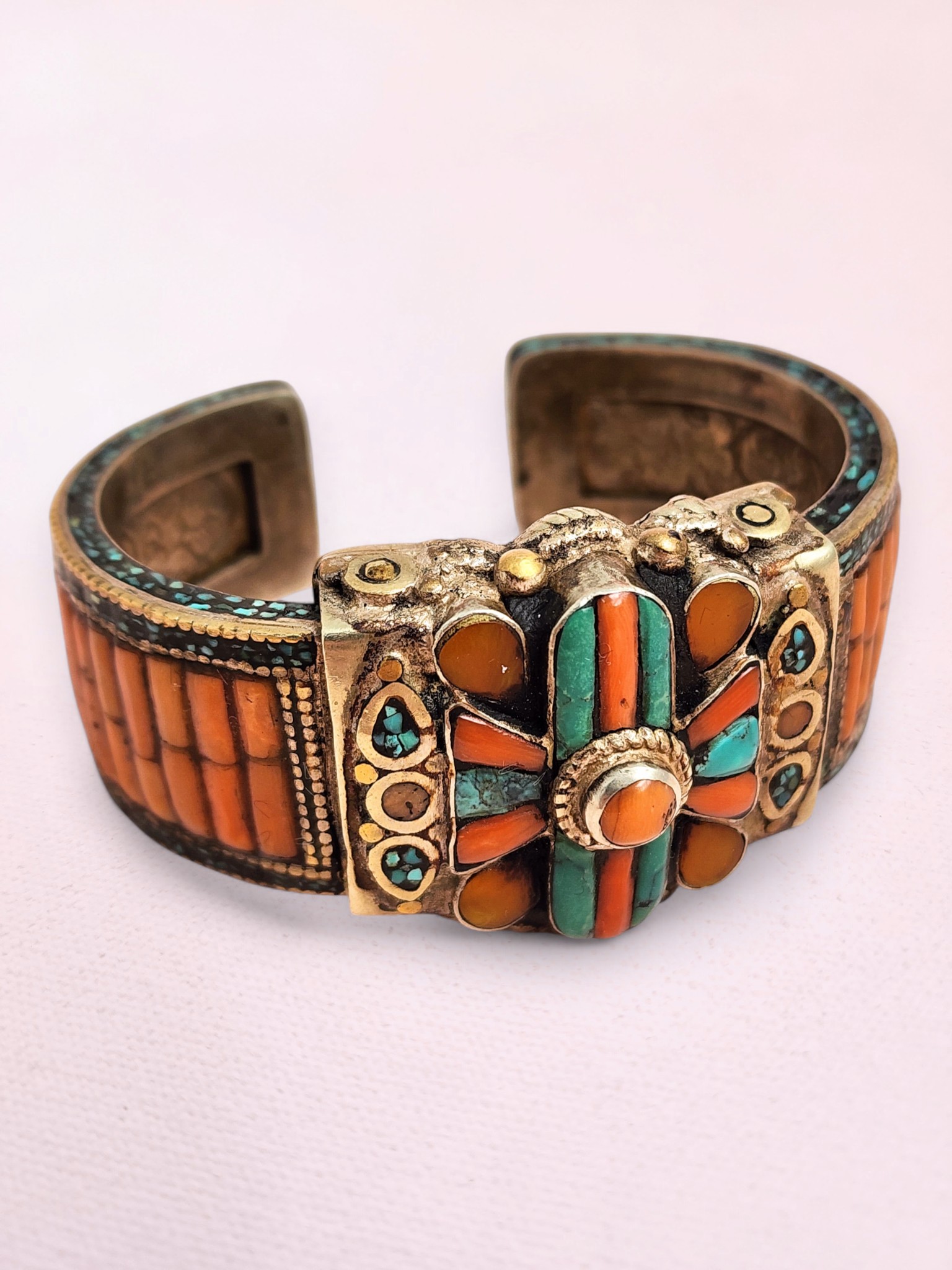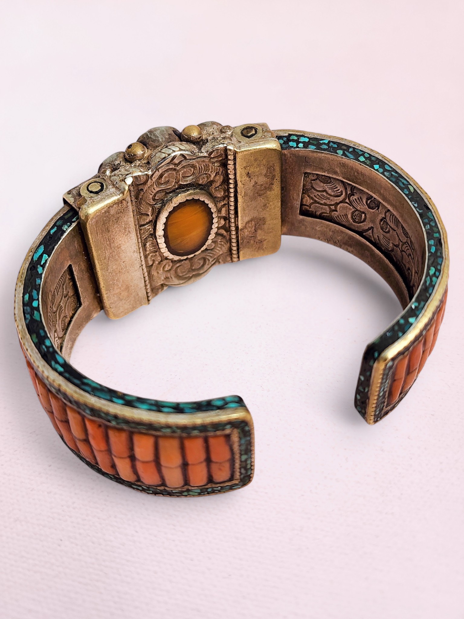 Vintage Tibetan silver and brass cuff bracelet with coral, turquoise & amber inlay. Authentic handmade Himalayan jewelry with ornate centerpiece & sacred stones.