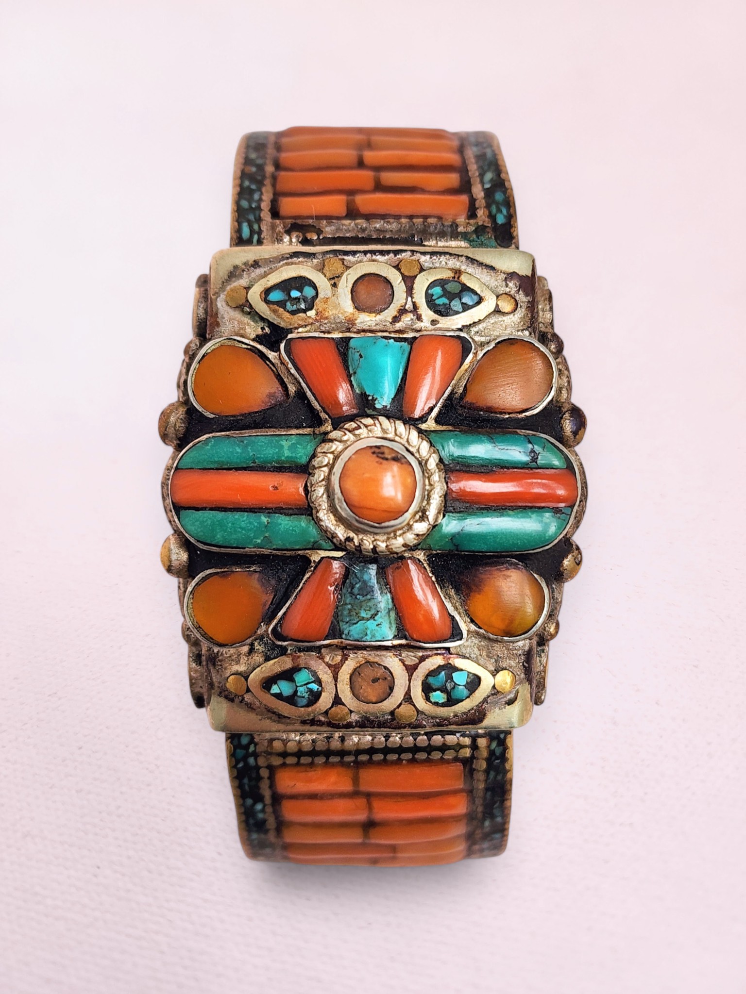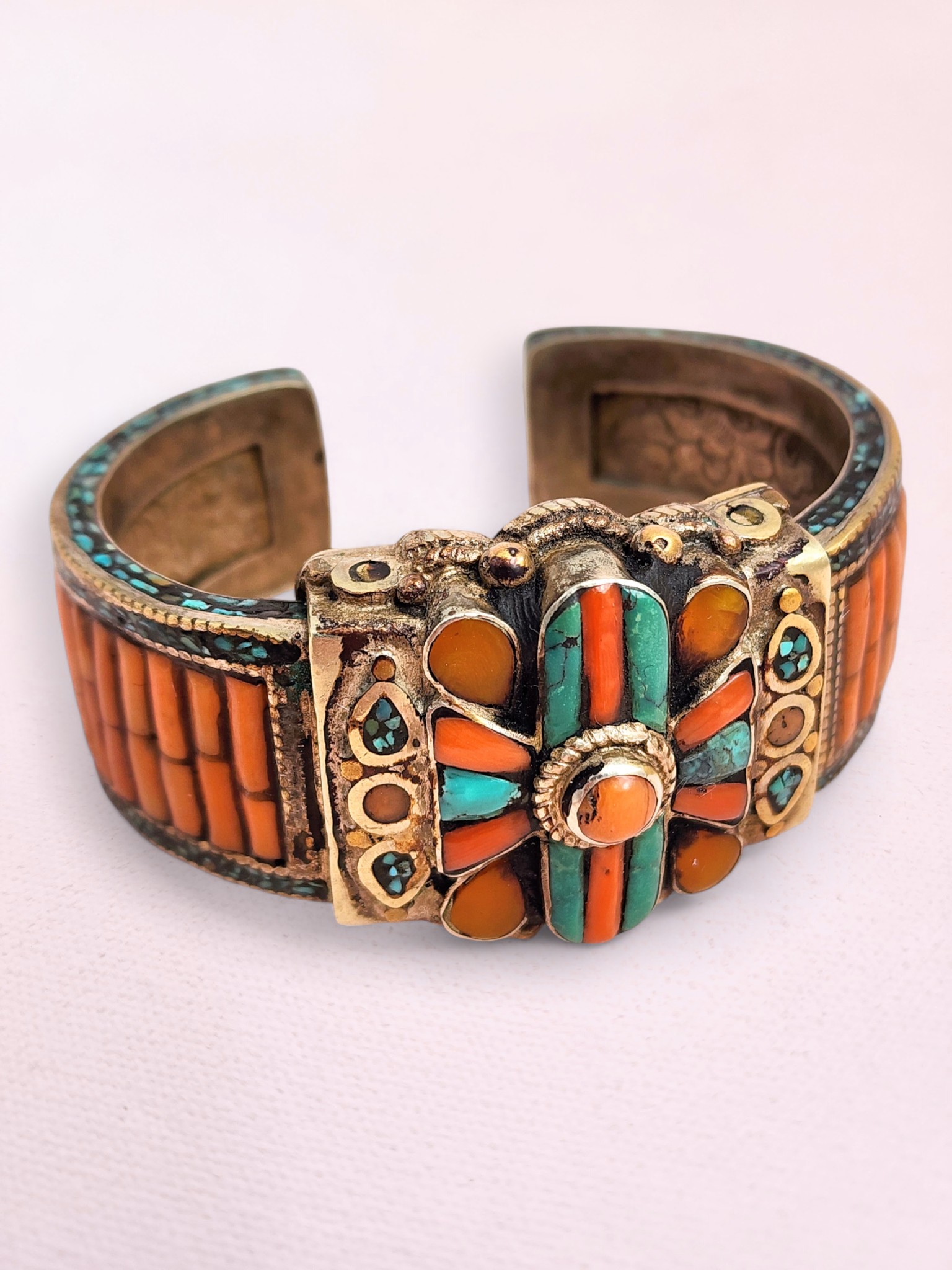 This authentic vintage Tibetan bracelet is a striking piece of Himalayan artisan jewelry, handcrafted from a blend of sterling silver and brass and adorned with vibrant orange-red coral, turquoise, and amber inlays. The bracelet’s bold, symmetrical centerpiece features intricate floral and geometric designs that reflect the rich spiritual and cultural symbolism of Tibetan craftsmanship.