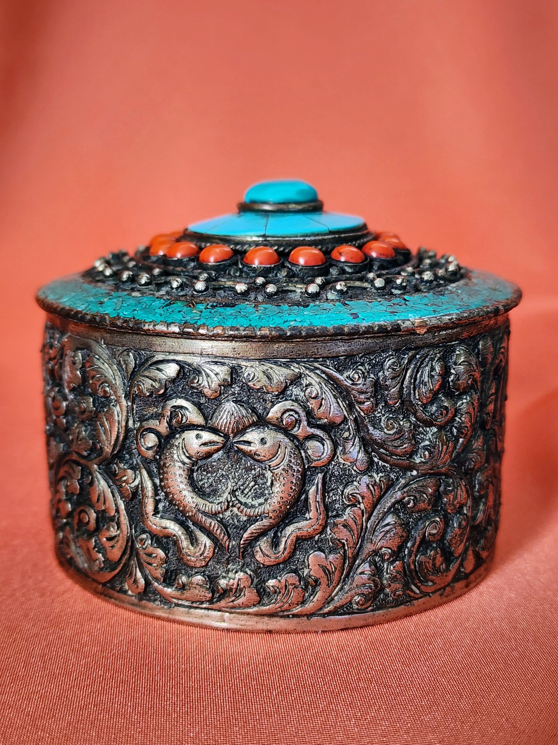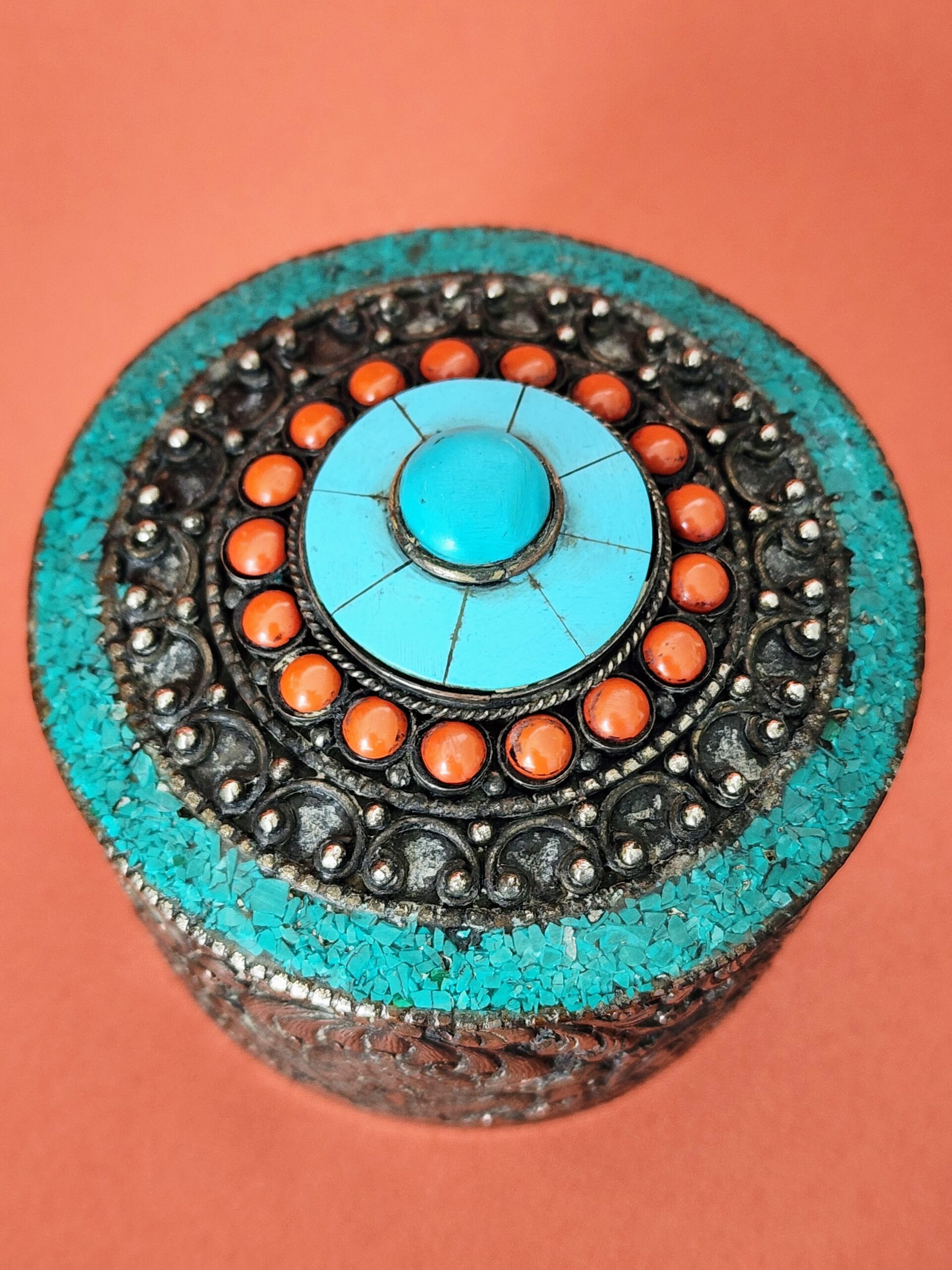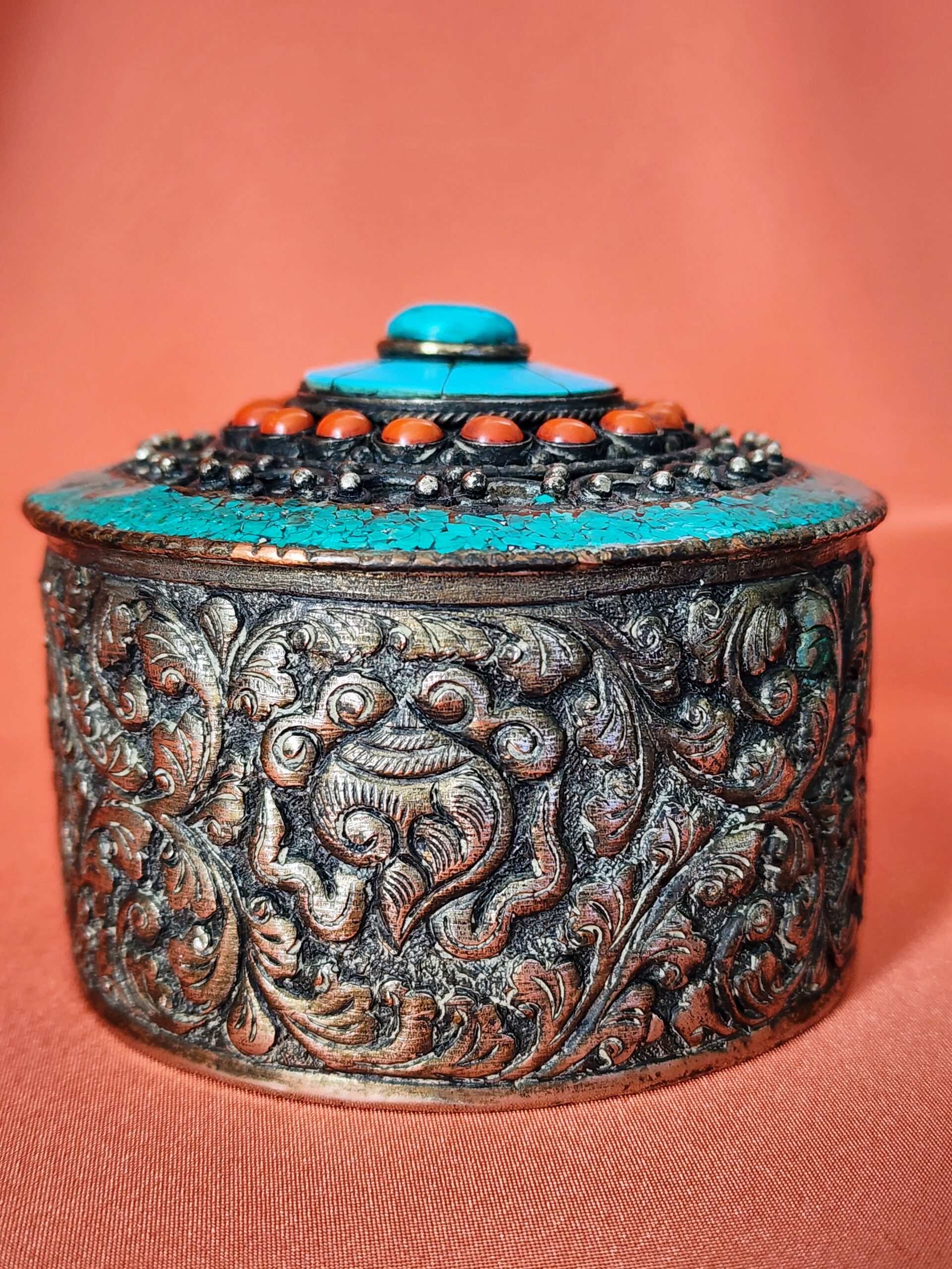 Keywords: Tibetan silver box, turquoise coral offering box, Himalayan repousse box, Buddhist, tika box, Tibetan jewelry box, crushed turquoise lid, coral cabochon box, Himalayan antique silver, Buddhist auspicious symbols box, Nepal silver ritual container