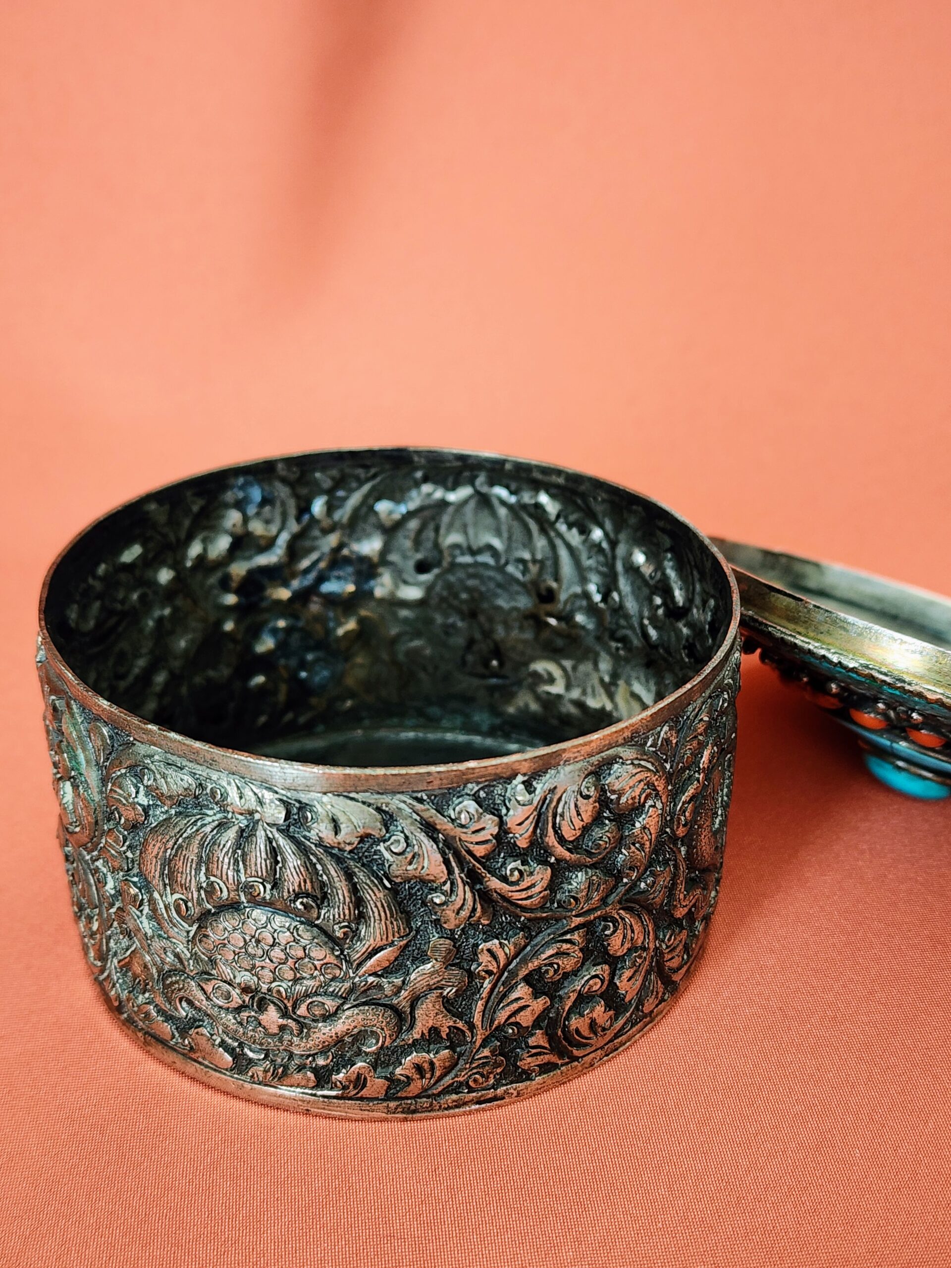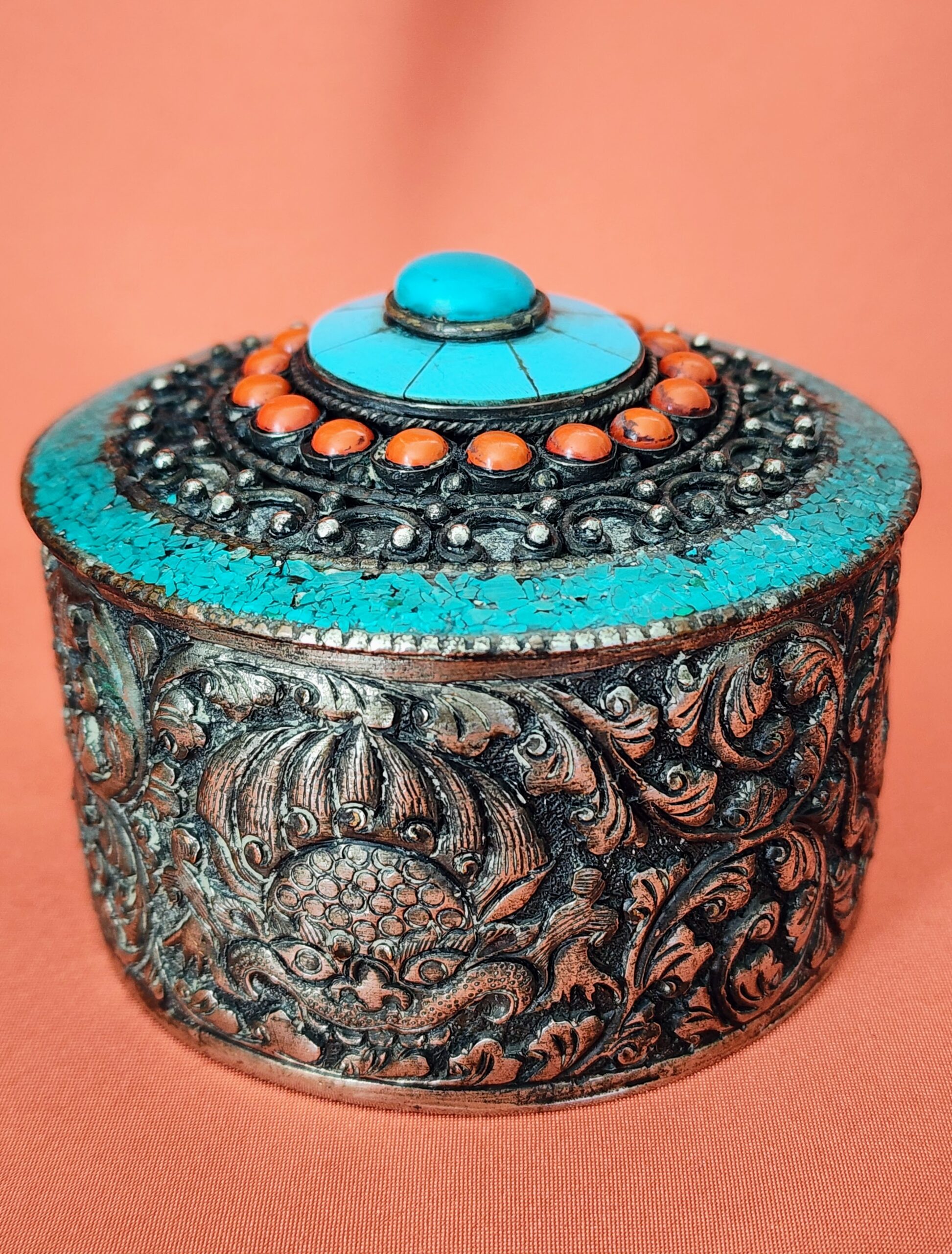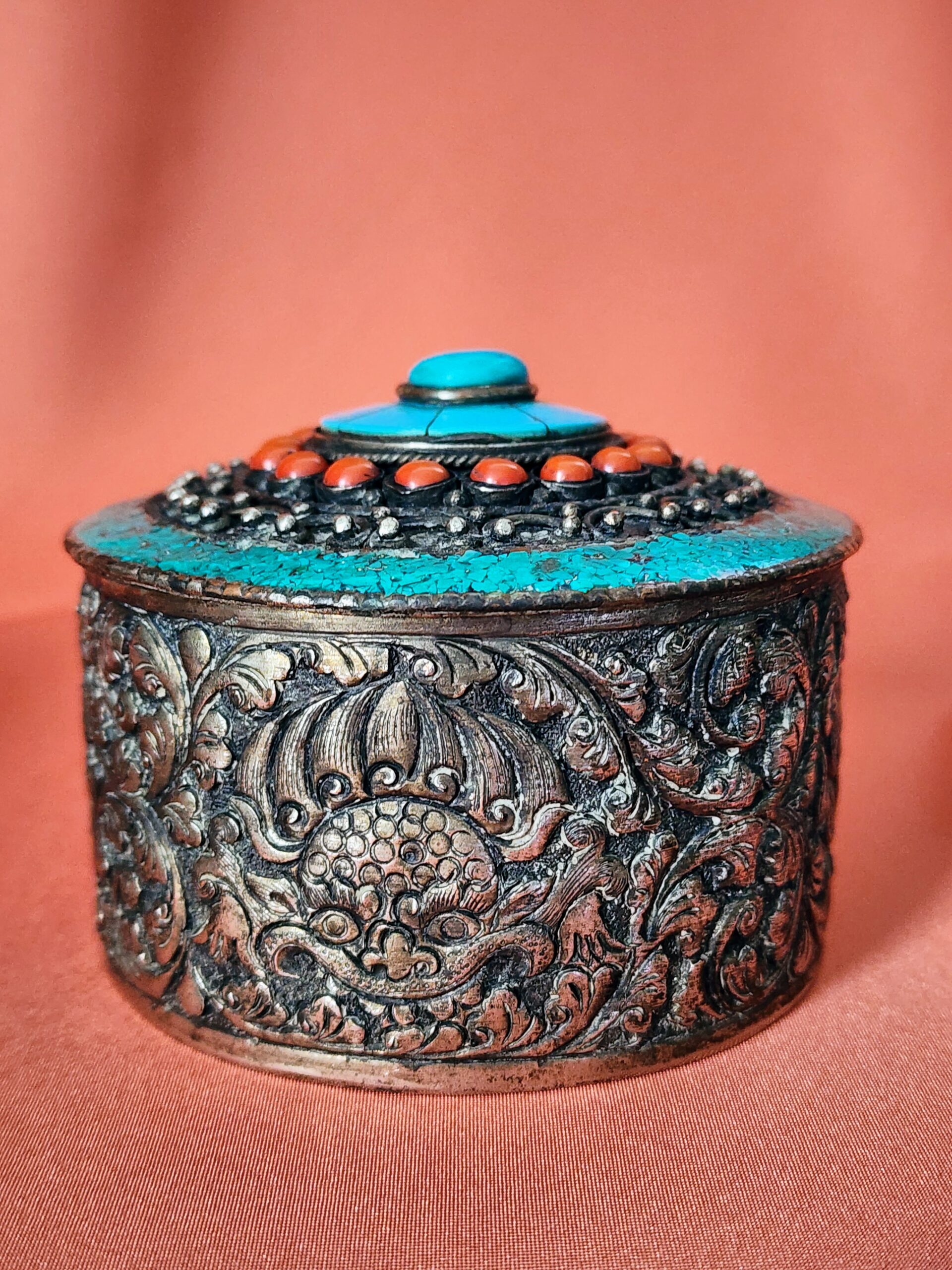 Keywords: Tibetan silver box, turquoise coral offering box, Himalayan repousse box, Buddhist, tika box, Tibetan jewelry box, crushed turquoise lid, coral cabochon box, Himalayan antique silver, Buddhist auspicious symbols box, Nepal silver ritual container