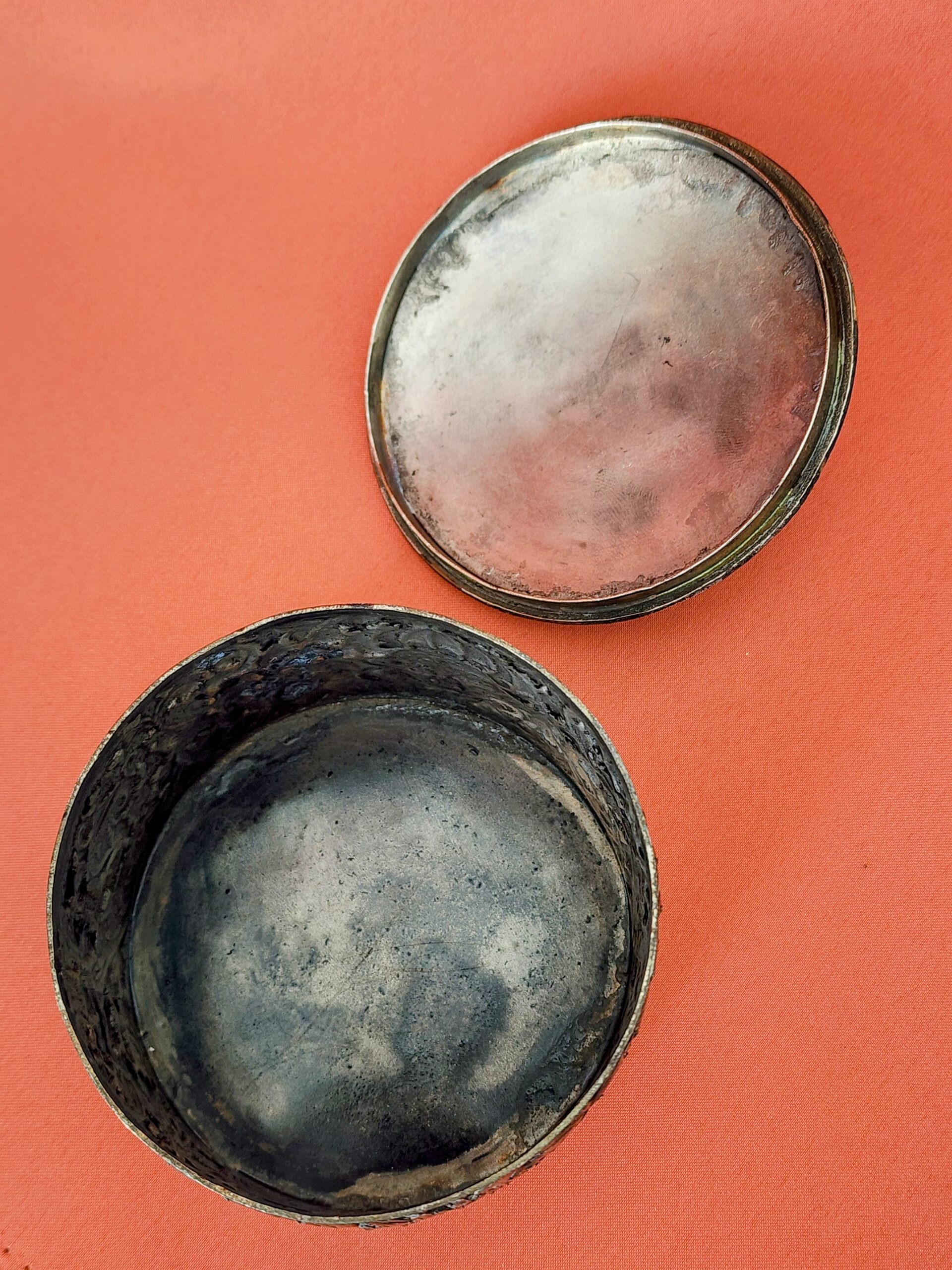 This exceptional vintage Tibetan silver jewelry box is a tour de force of Himalayan metalwork, combining three distinct decorative traditions in a single richly layered object. The cylindrical body is covered in dense repousse metalwork depicting three of Buddhism’s auspicious symbols — a scaled fish, a conch shell, and two fierce demon faces — each emerging from swirling acanthus scrollwork across the exterior walls. The interior reveals the same embossed detailing carried through to the inside surface, a mark of genuine craftsmanship rather than decorative shortcut.