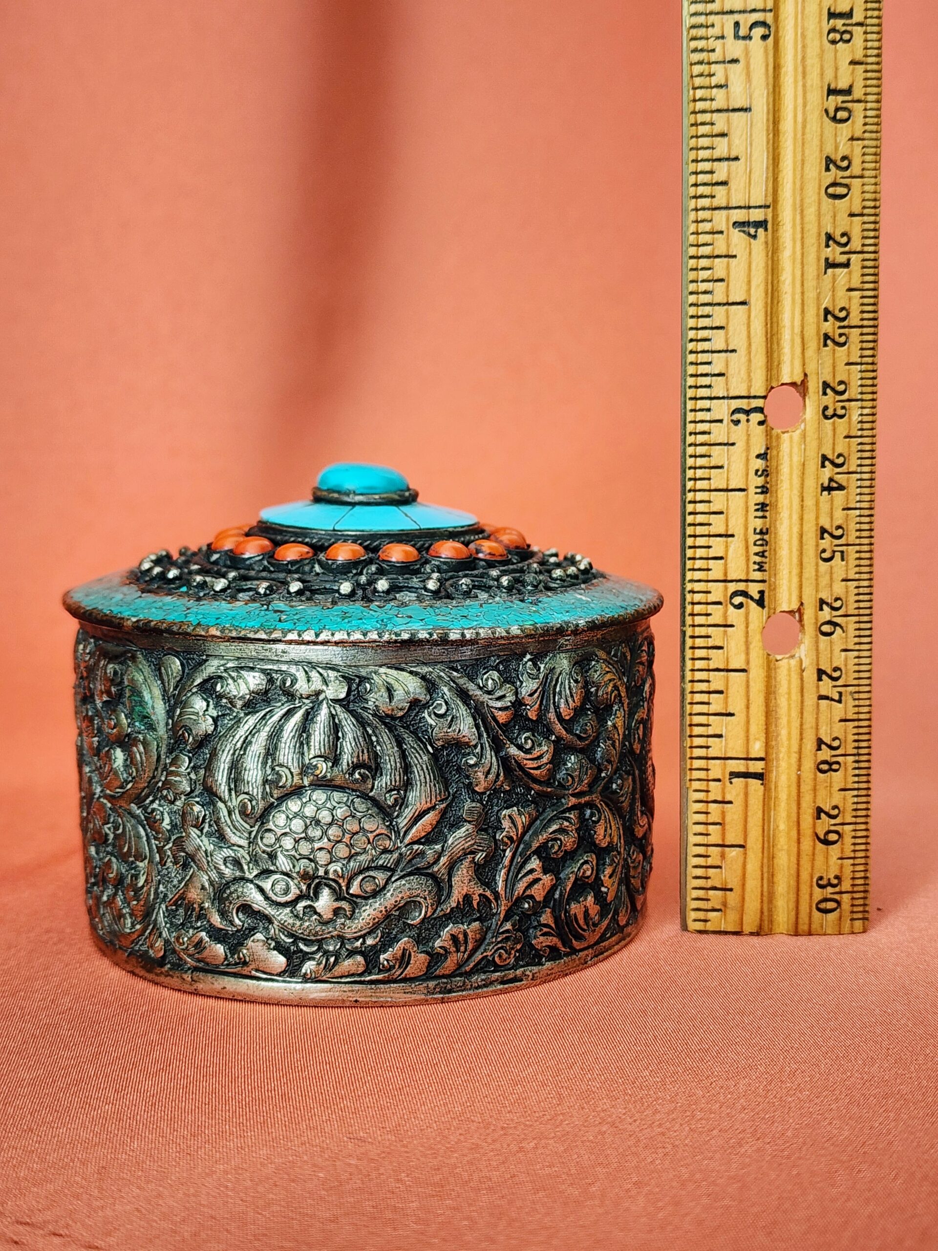 Vintage Tibetan Silver Trinket Box with Coral & Turquoise | Himalayan Repousse Offering Box | Buddhist Symbols Jewelry Box